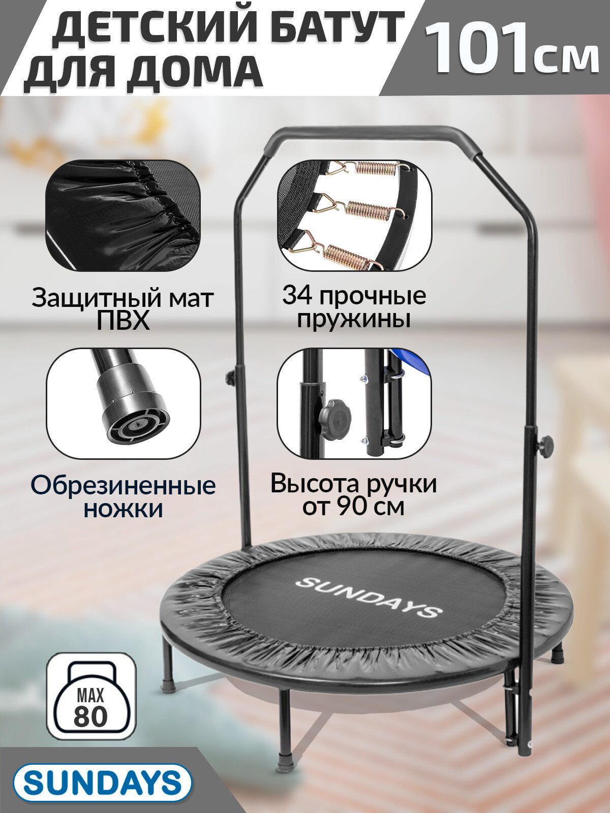 Батут с ручкой Sundays D101 (черный), батут для дома, батут спортивный, фитнес батут, активные игры интересное: