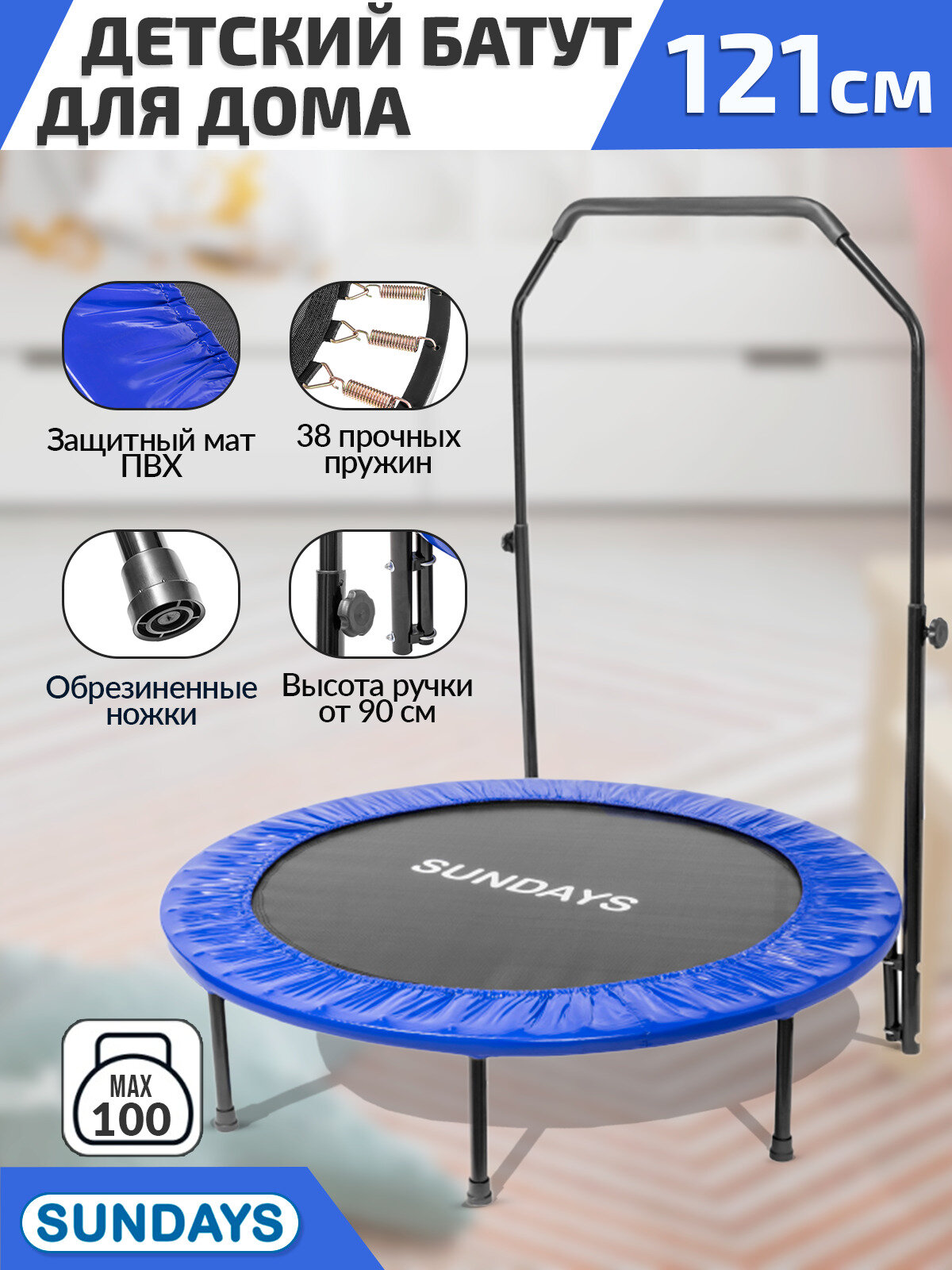 Батут с ручкой Sundays D121 синий, батут для дома, батут спортивный, фитнес батут, активные игры интересное: