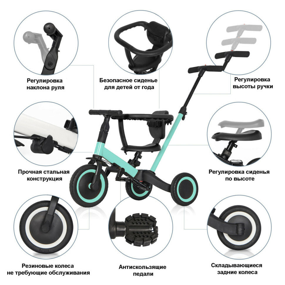 Детский беговел-велосипед 6в1 с родительской ручкой, зеленый - TR008-CYAN