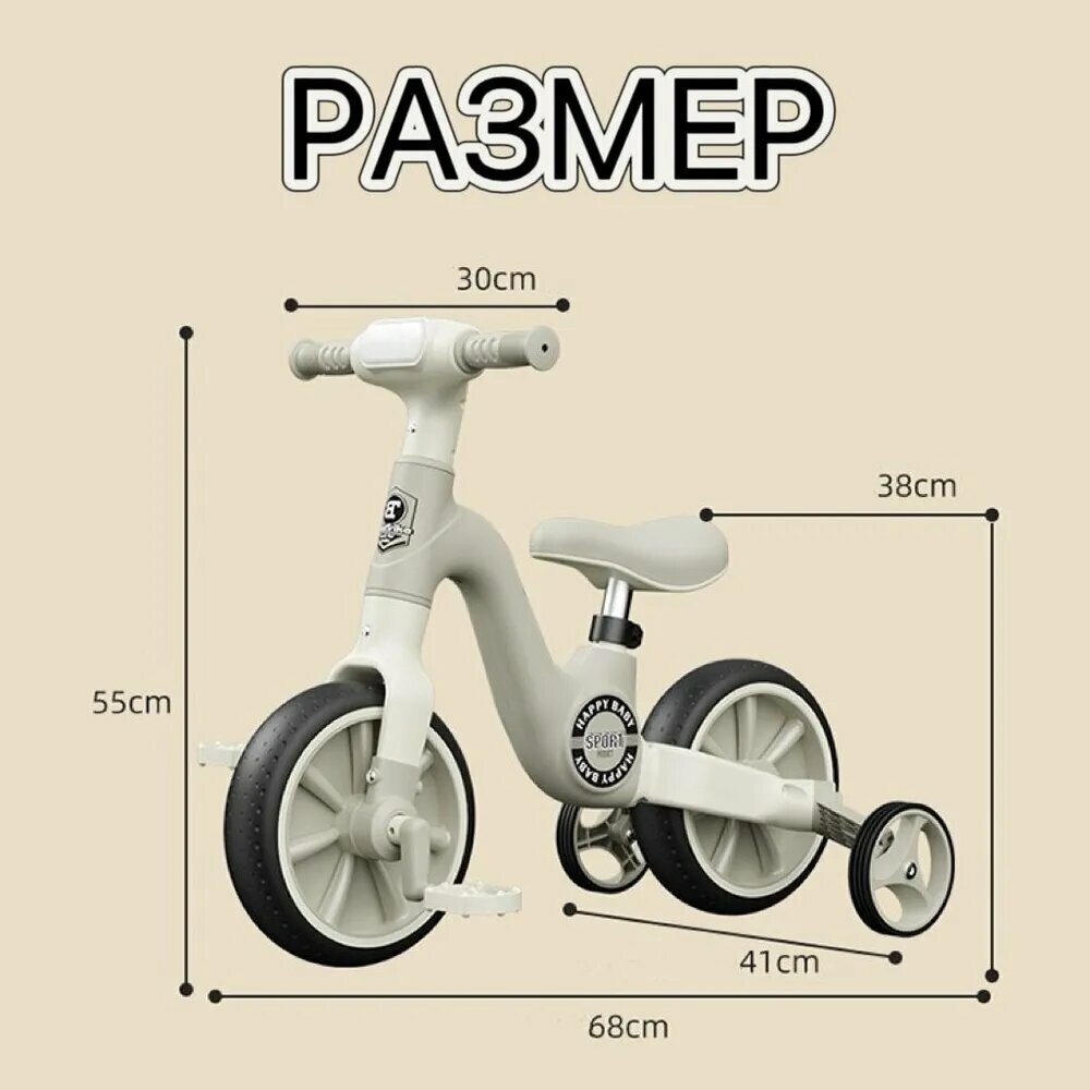 | Комплектация | Беговел-трансформер "2 в 1", для детей от 1 года, Поролоновое колесо, белый/хаки,Со светом |
