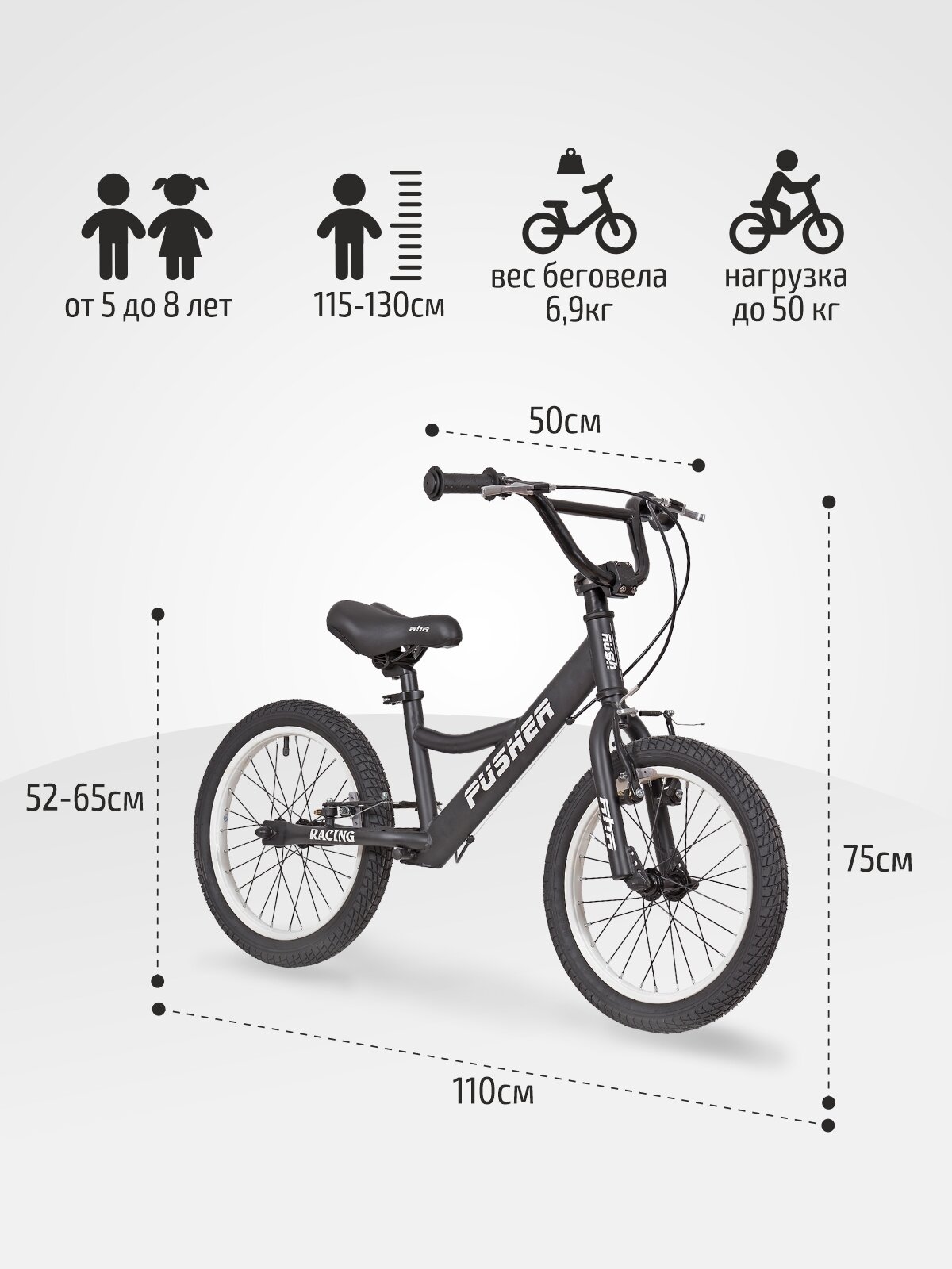 Купить Беговел 16" RUSH HOUR PUSHER рост 120-135 см черный. Детский транспорт для детей 6, 7 и 8 лет велобег самокат без педалей толокар легкий мотоцикл