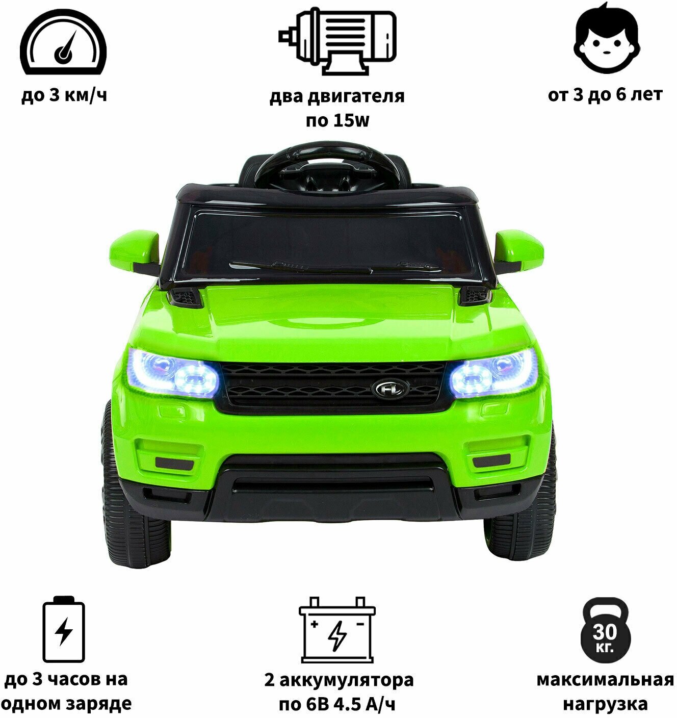 | Комплектация | корпус - 1 шт. / сиденье со спинкой - 1 шт. / колеса пластиковые - 4 шт. / руль - 1 шт. / ремни безопасности / 2 аккумулятора на 6V4.5AH / пульт ДУ - 1 шт. / 2 двигателя мощностью по 20w / зарядное устройство - 1 шт / инструкция / гарантийный талон. |