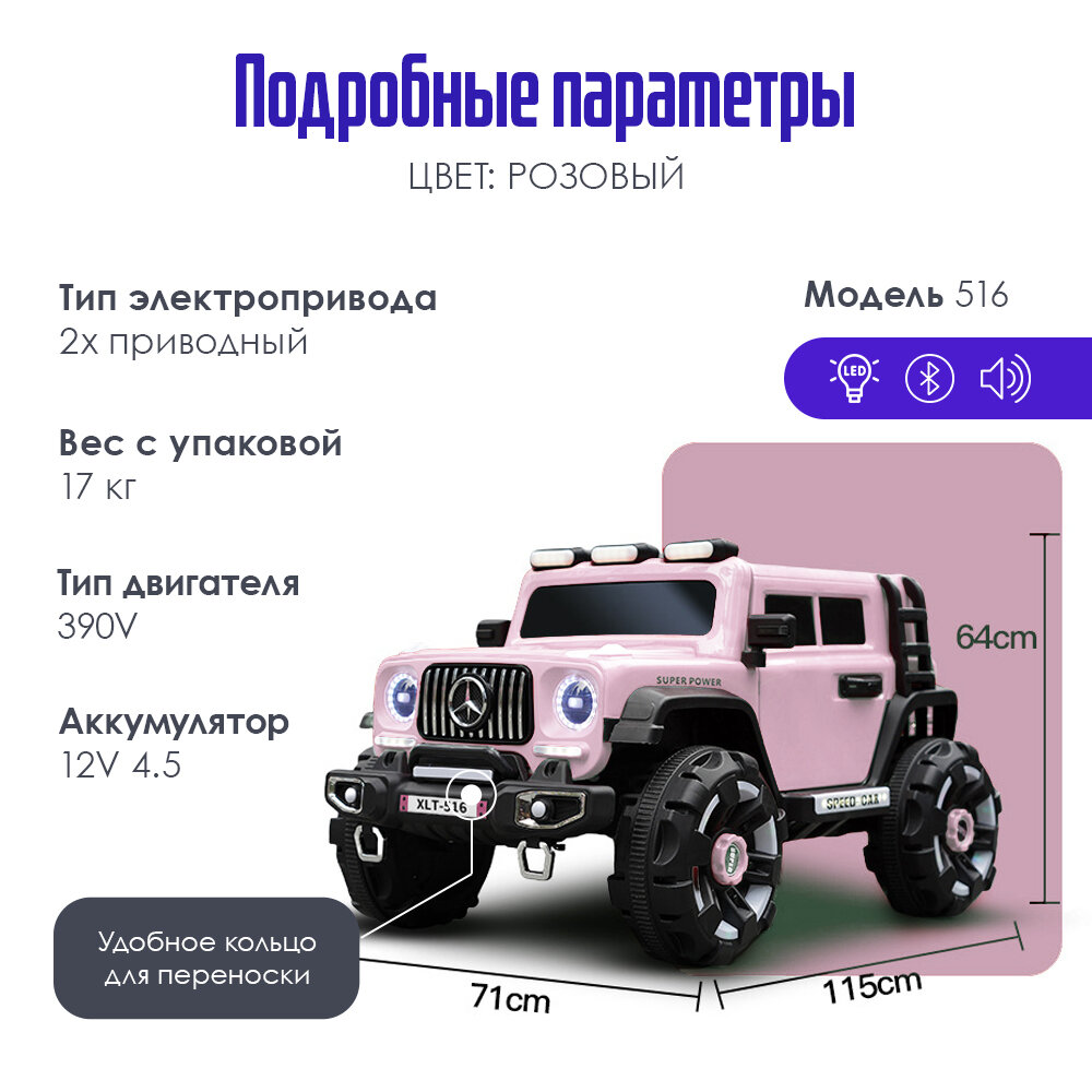 | Опции | MP3 / USB-вход / bluetooth / светящиеся фары |