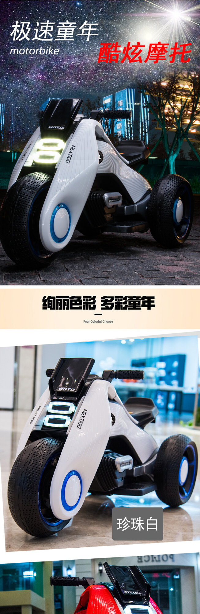 Купить Детский электрический мотоцикл, жемчужно-белый, двойной привод, для мальчиков