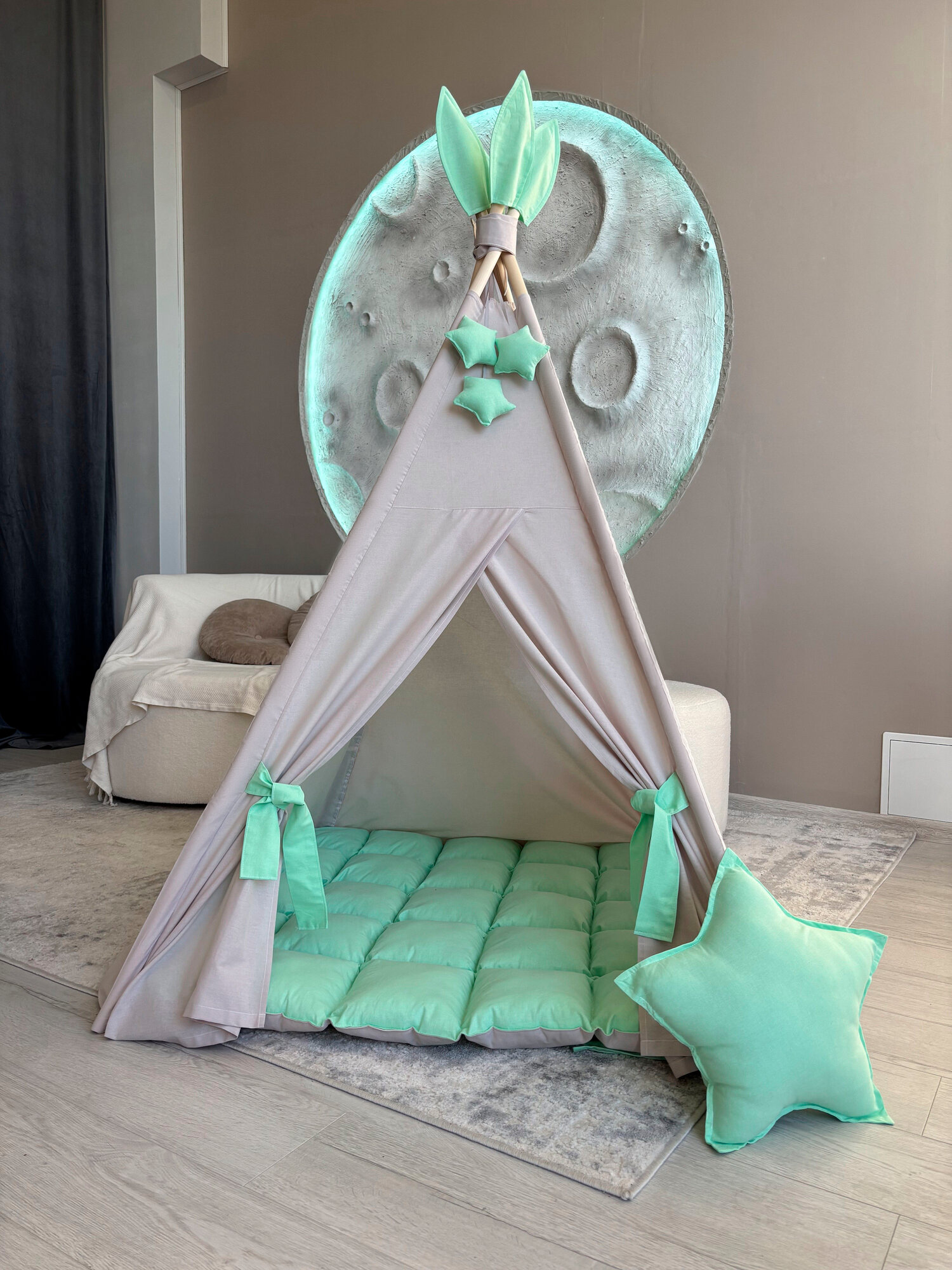 Купить Вигвам детский СЕРЫЙ с САЛАТОВЫМ с ковриком, Комплект SWEET HOME for kids