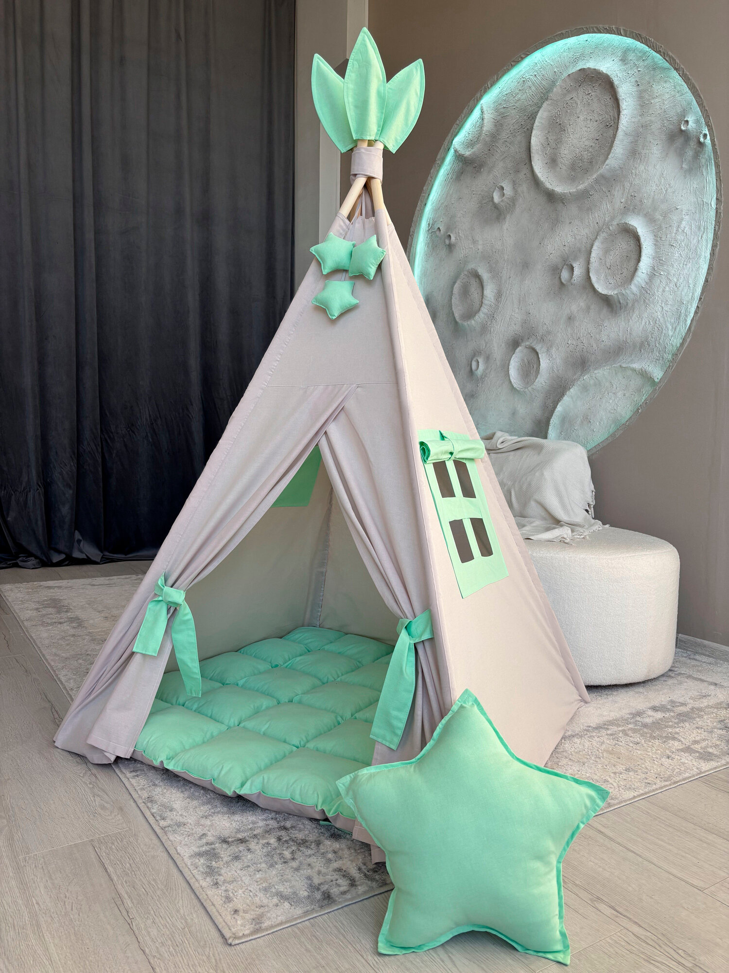 Вигвам детский СЕРЫЙ с САЛАТОВЫМ с ковриком, Комплект SWEET HOME for kids интересное: