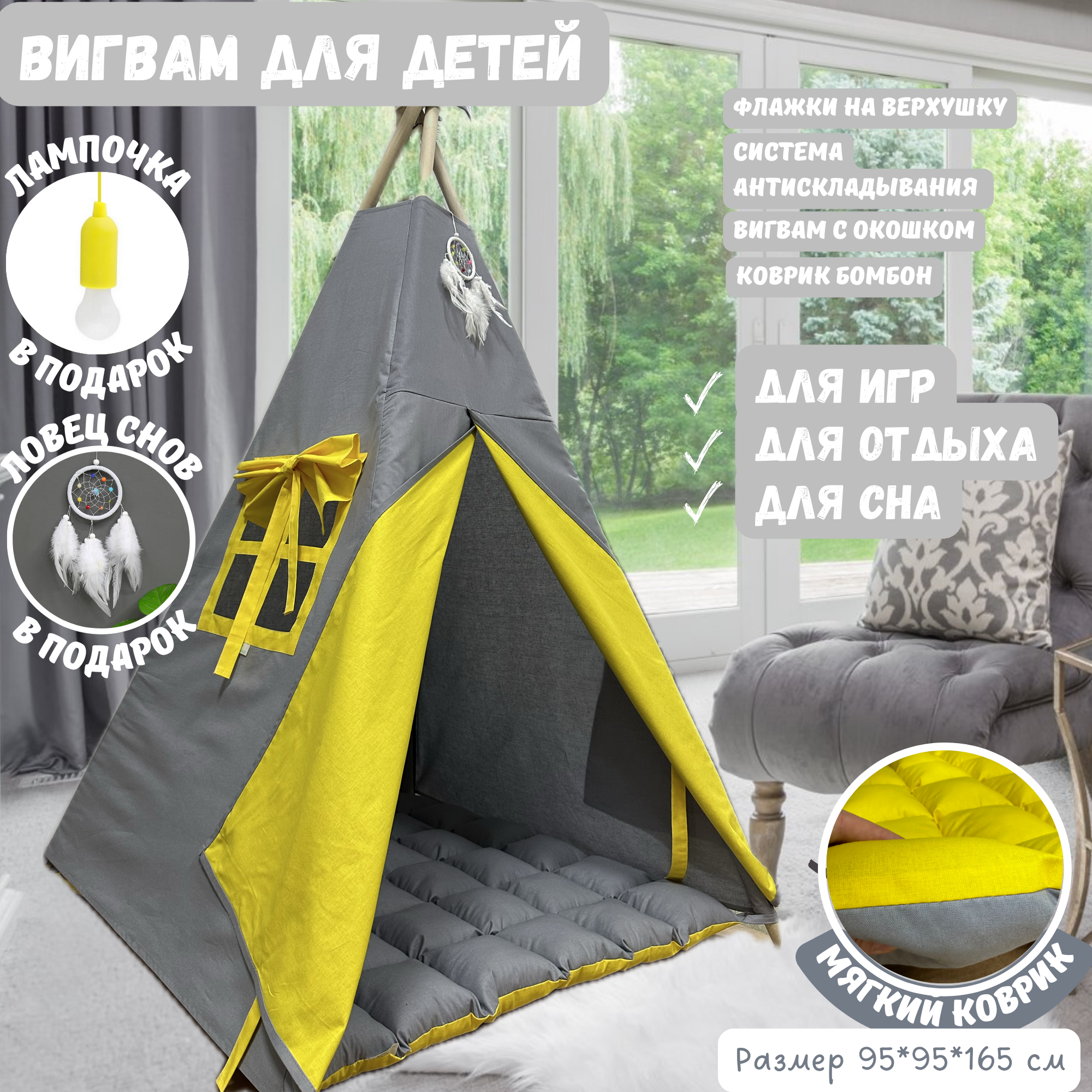 Вигвам детский Льняной с ковриком складная конструкция антискладывание лампочка ловец снов