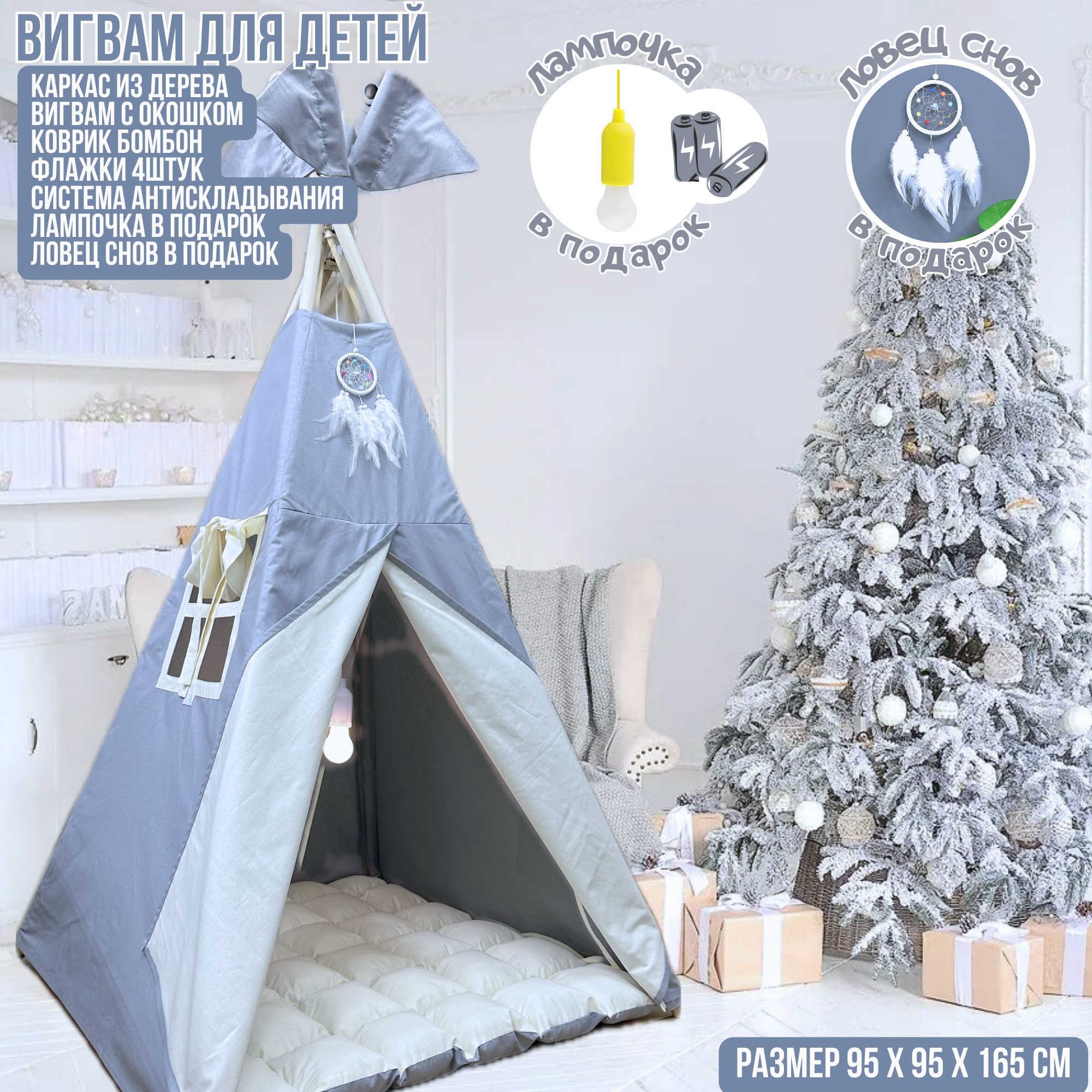 | Подробная комплектация | вигвам с окошком, коврик бомбон, флажки, каркас, ловец снов и лампочка в подарок |