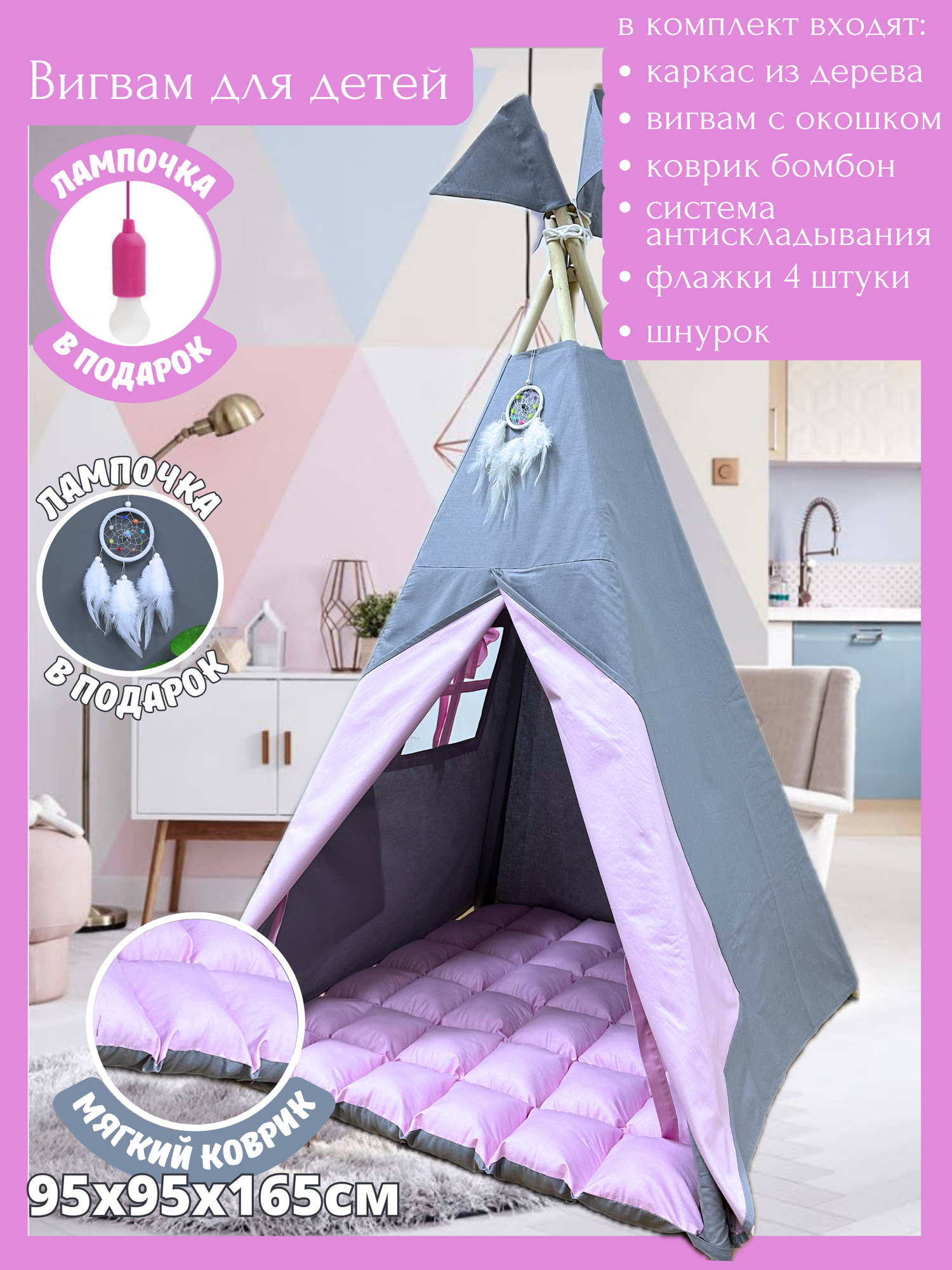 | Подробная комплектация | вигвам с окошком, коврик бомбон, флажки, каркас, ловец снов и лампочка в подарок |
