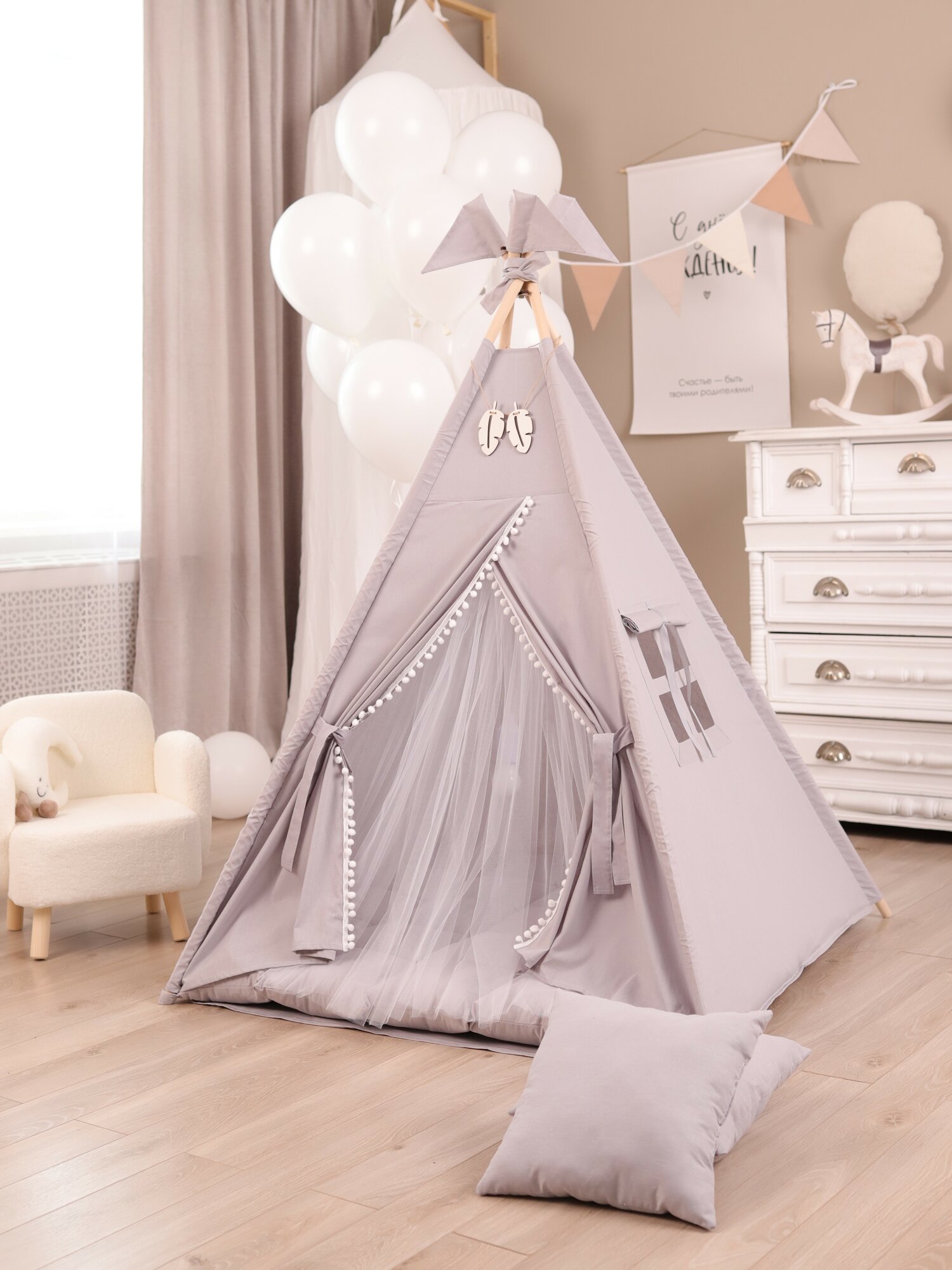 Вигвам Палатка детская игровая, домик для детей, 2 подушки, корзина для игрушек, кемпинговая лампа, гирлянда из флажков