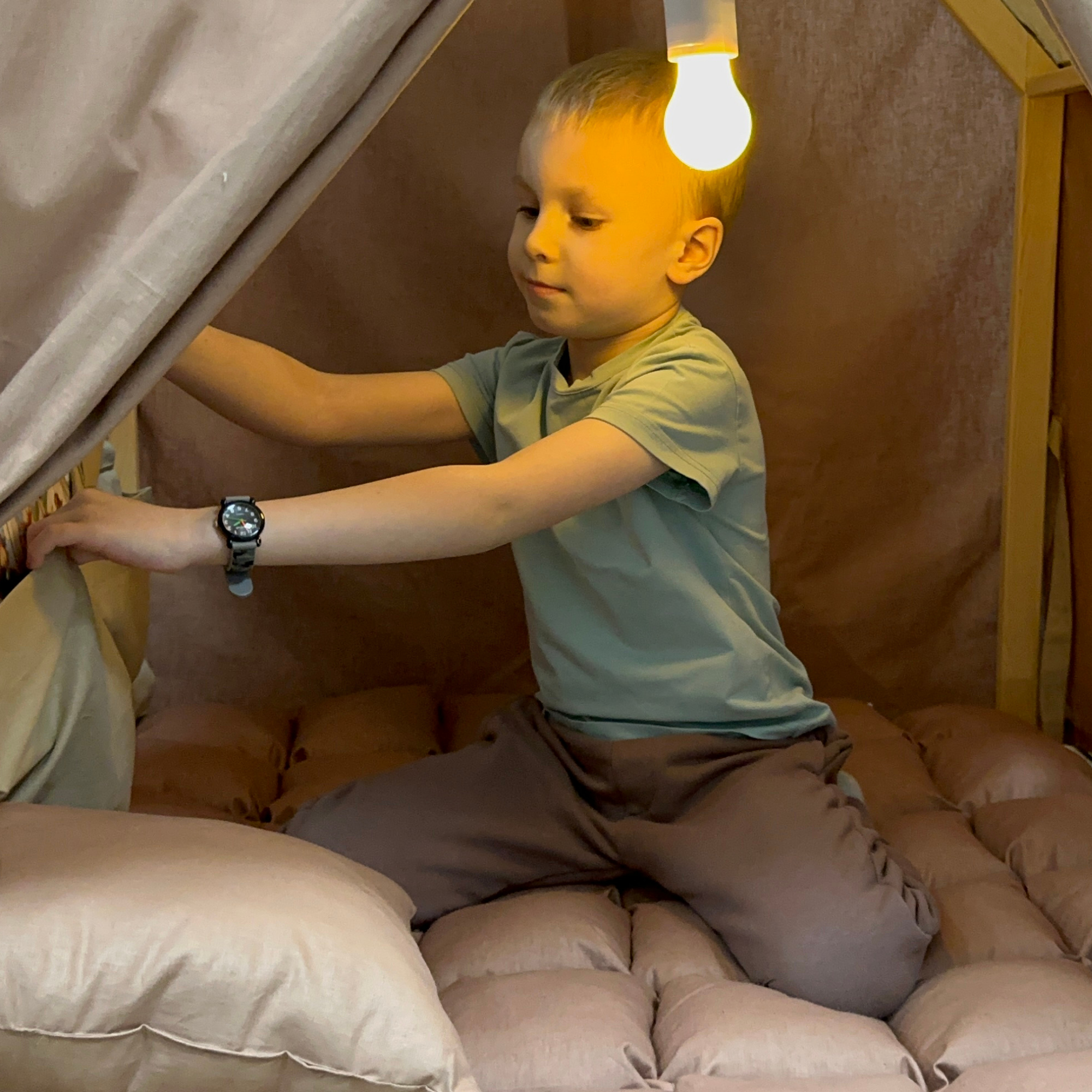 | Комплектация | домик для детей, каркас из дерева, коврик бомбон, подушка, конфирматы,ключ, органайзер, лампочка в подарок |