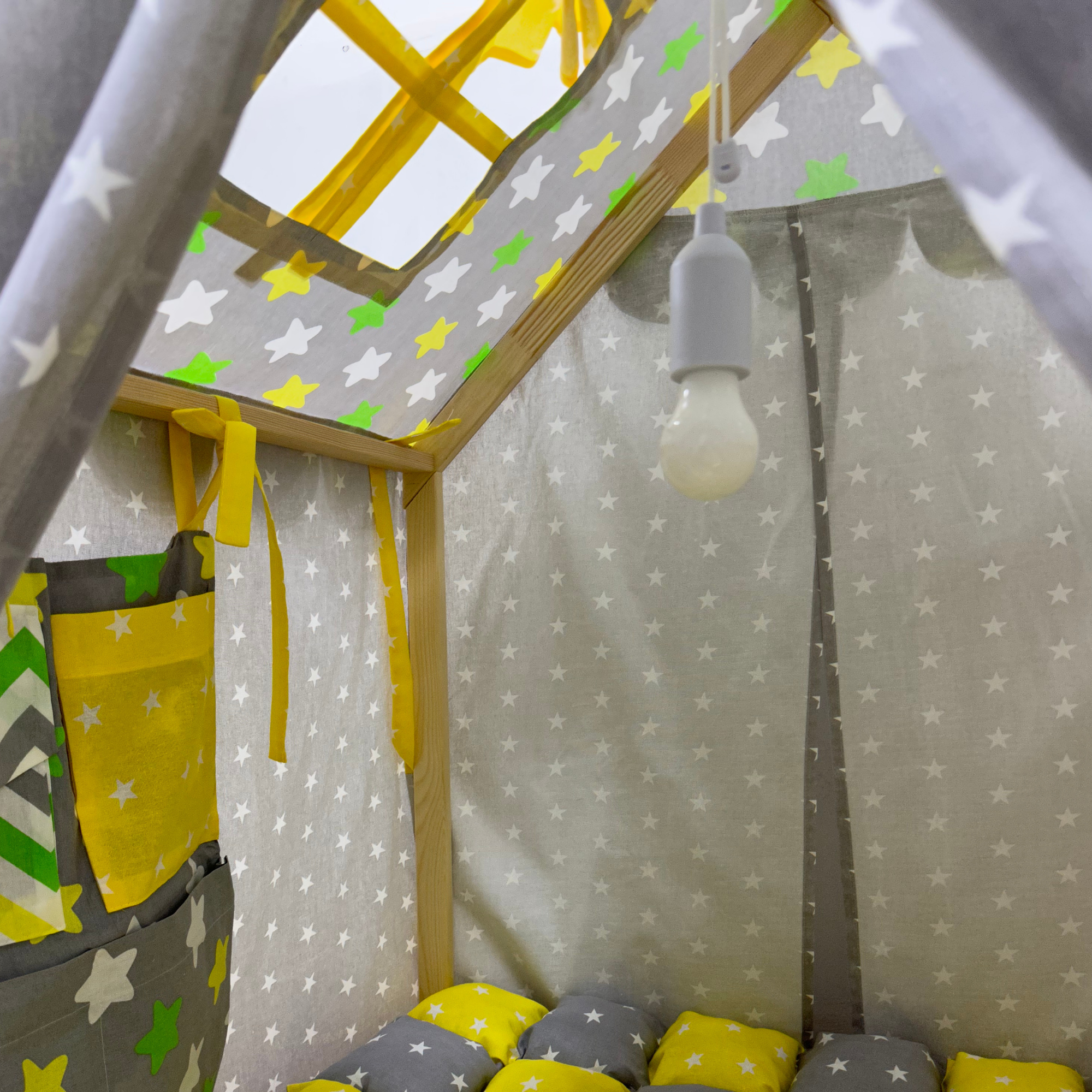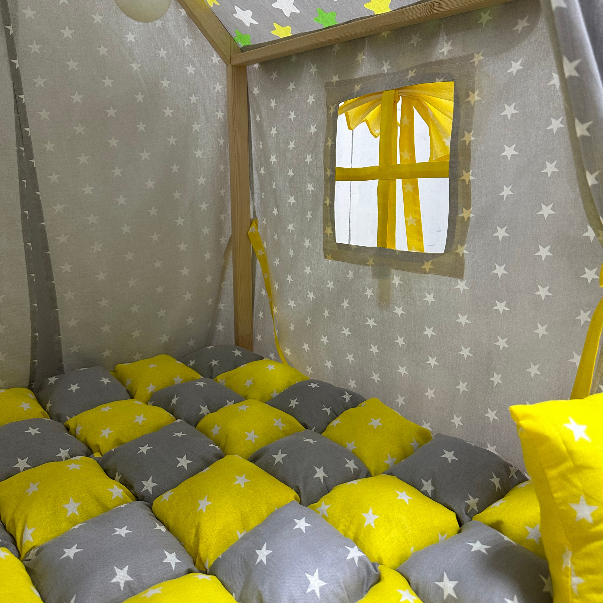 | Комплектация | домик для детей, каркас из дерева, коврик бомбон, подушка, конфирматы,ключ, органайзер, лампочка в подарок |