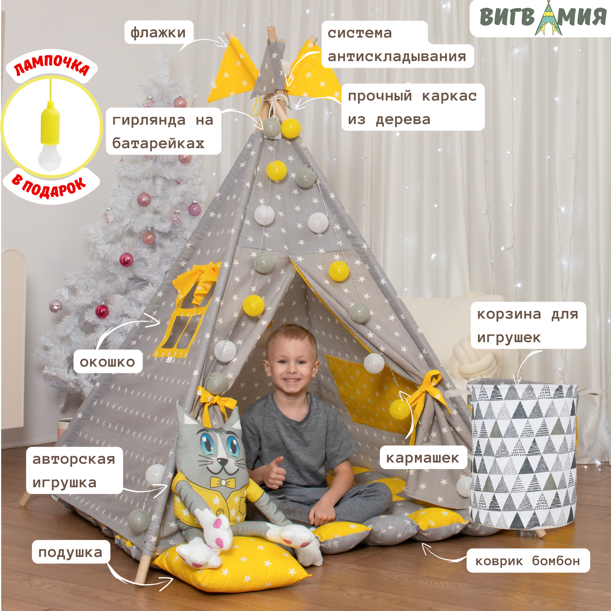 | Комплектация | вигвам, коврик, корзина для игрушек, игрушка, гирлянда, каркас, система антискадывания каркаса, шнурок, лампочка в подарок |