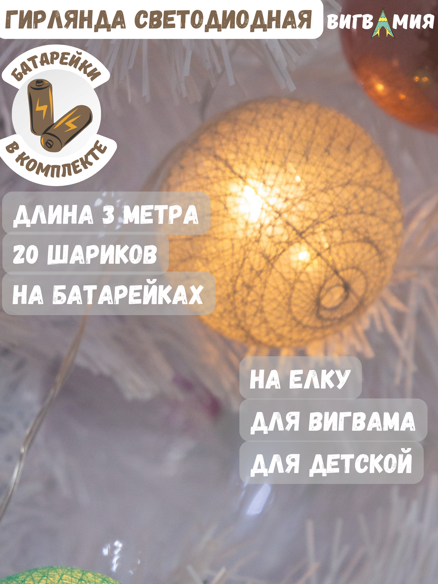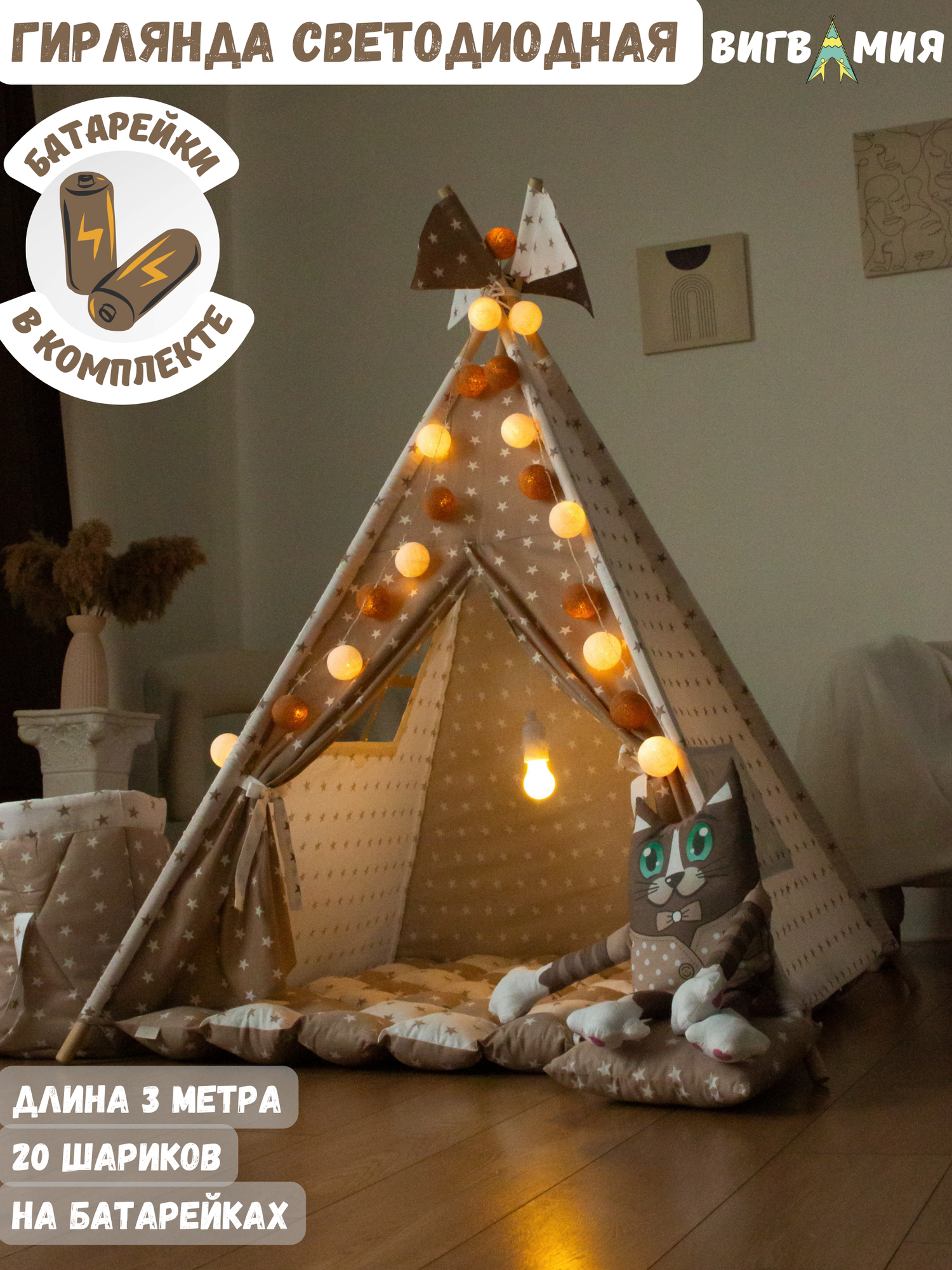| Комплектация | вигвам, коврик, корзина для игрушек, игрушка, гирлянда, каркас, система антискадывания каркаса, шнурок, лампочка в подарок |