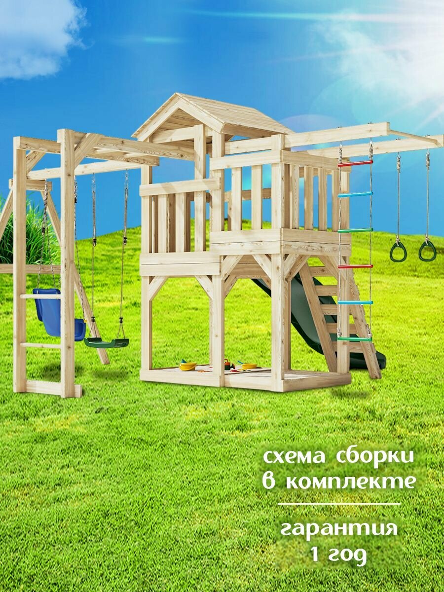 | В комплекте | домик, качели, лестница, песочница, рукоход, Игровая веранда, Крыша, Прямая горка |