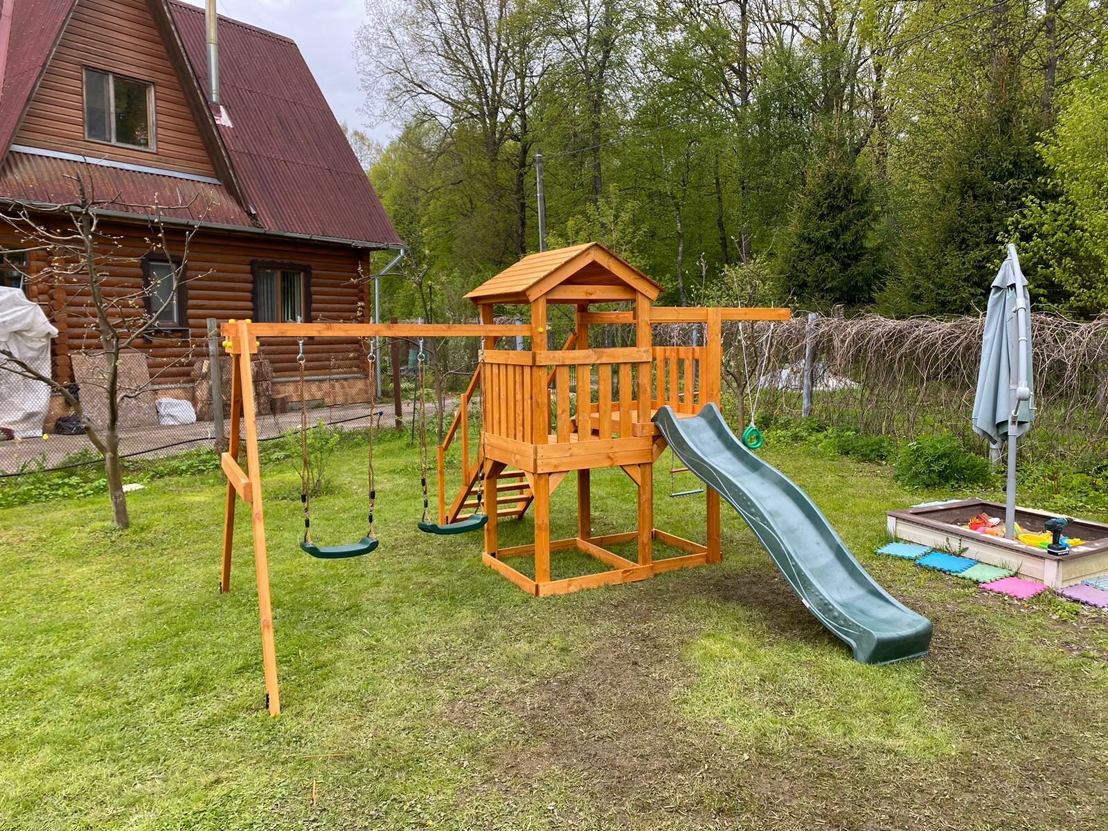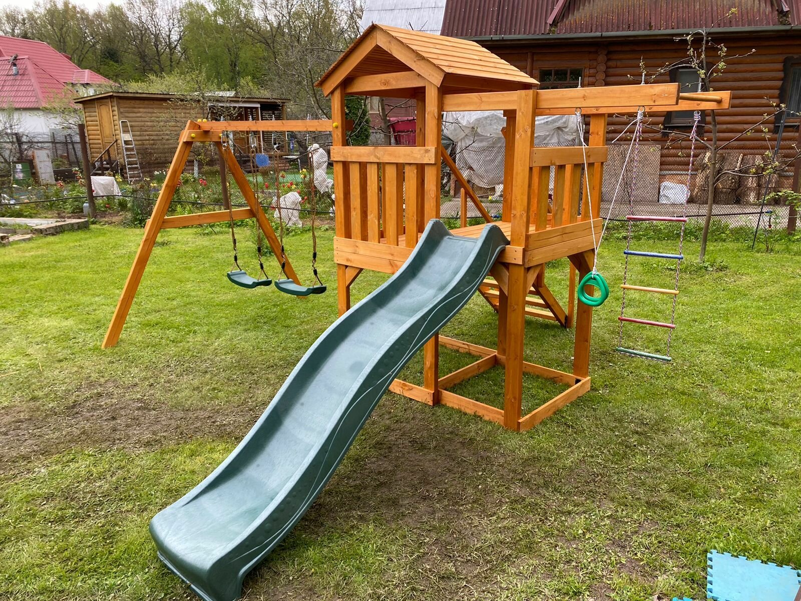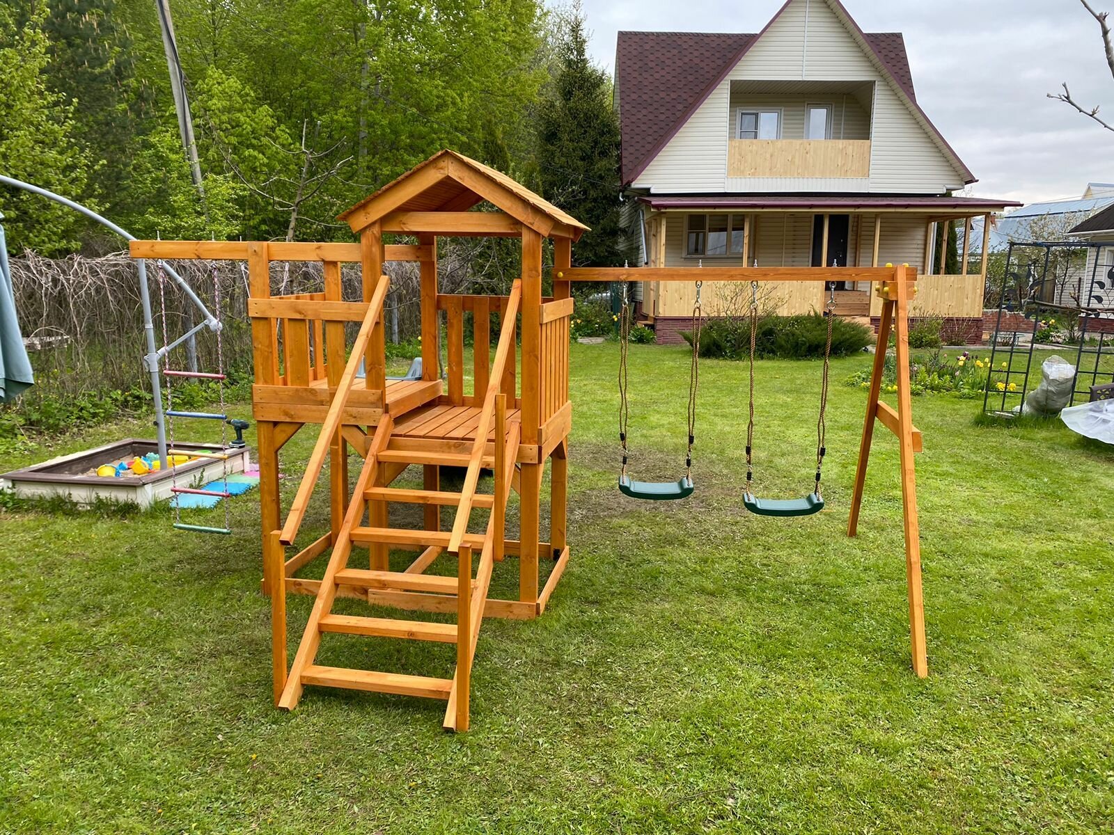 | В комплекте | домик, качели, лестница, песочница, рукоход, Игровая веранда, Крыша, Прямая горка |