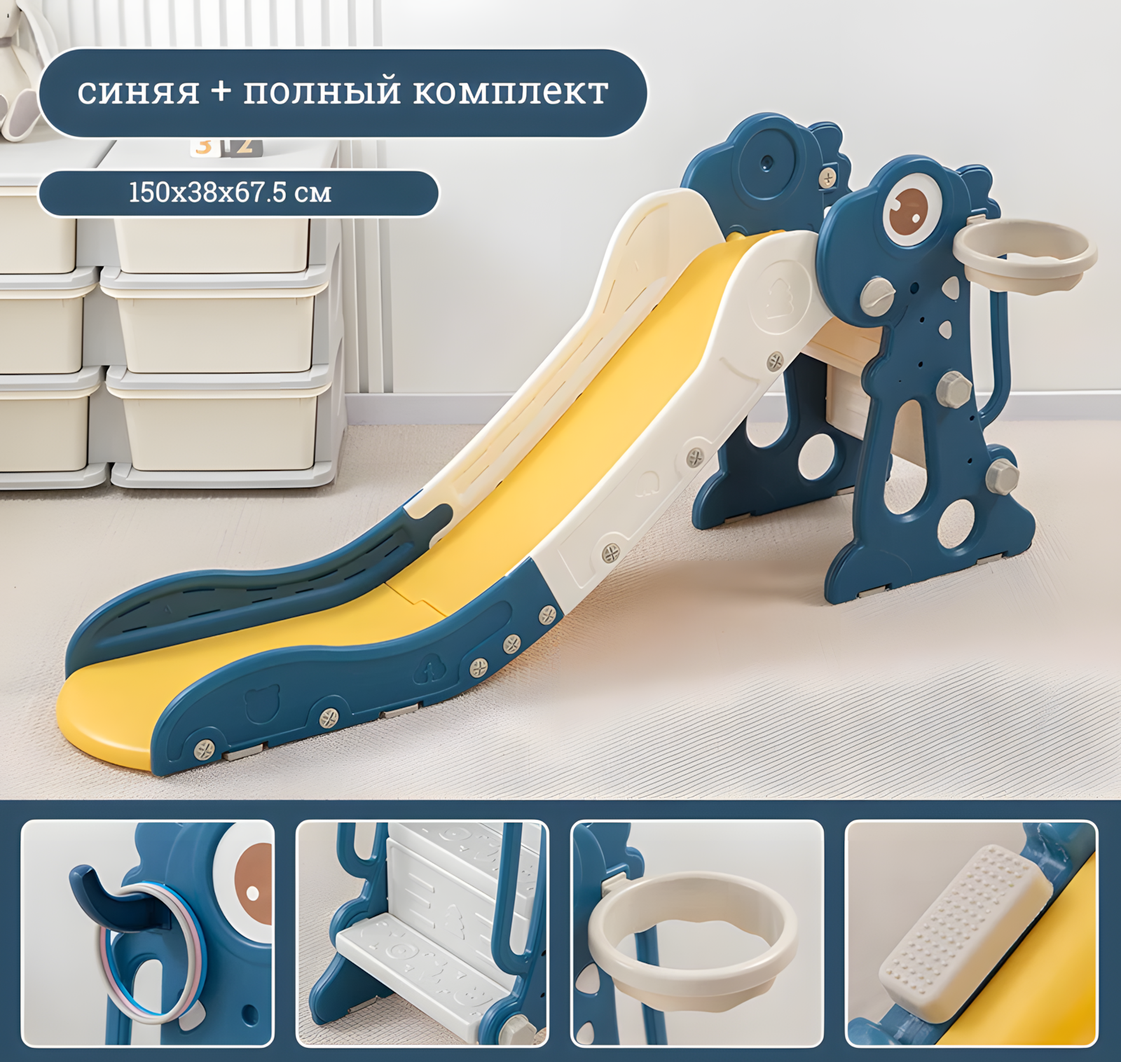 Детская горка с динозавриком, складная, многофункциональная, желто-синяя + баскетбольное кольцо