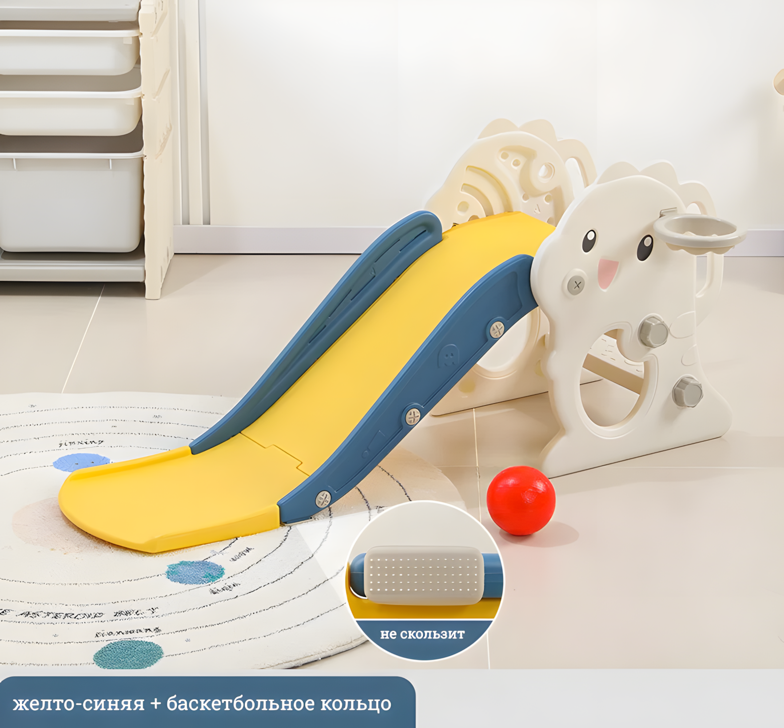 СохранитьДетская горка с динозавриком, складная, многофункциональная, желто-синяя + баскетбольное кольцо интересное:
