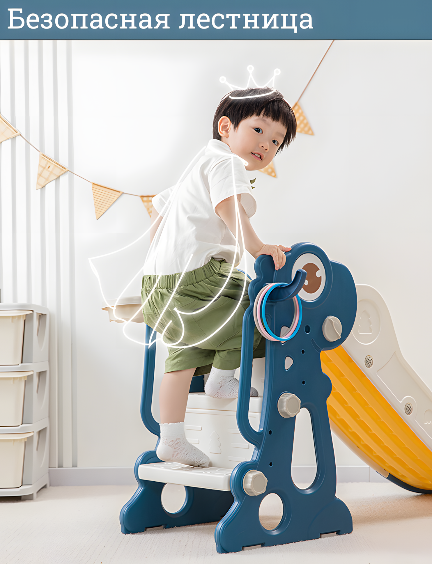 Детская горка с динозавриком, складная, многофункциональная, желто-синяя + баскетбольное кольцо
