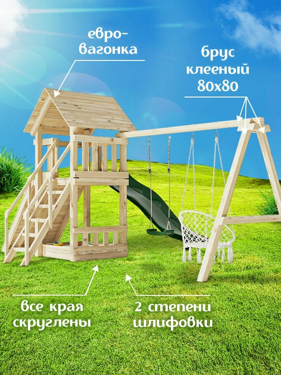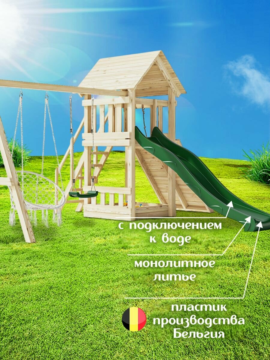 | В комплекте | брусья, домик, качели, лестница, песочница, сетка для лазания, Волнистая горка, Игровая веранда, Игровой модуль, Крыша, Перила |