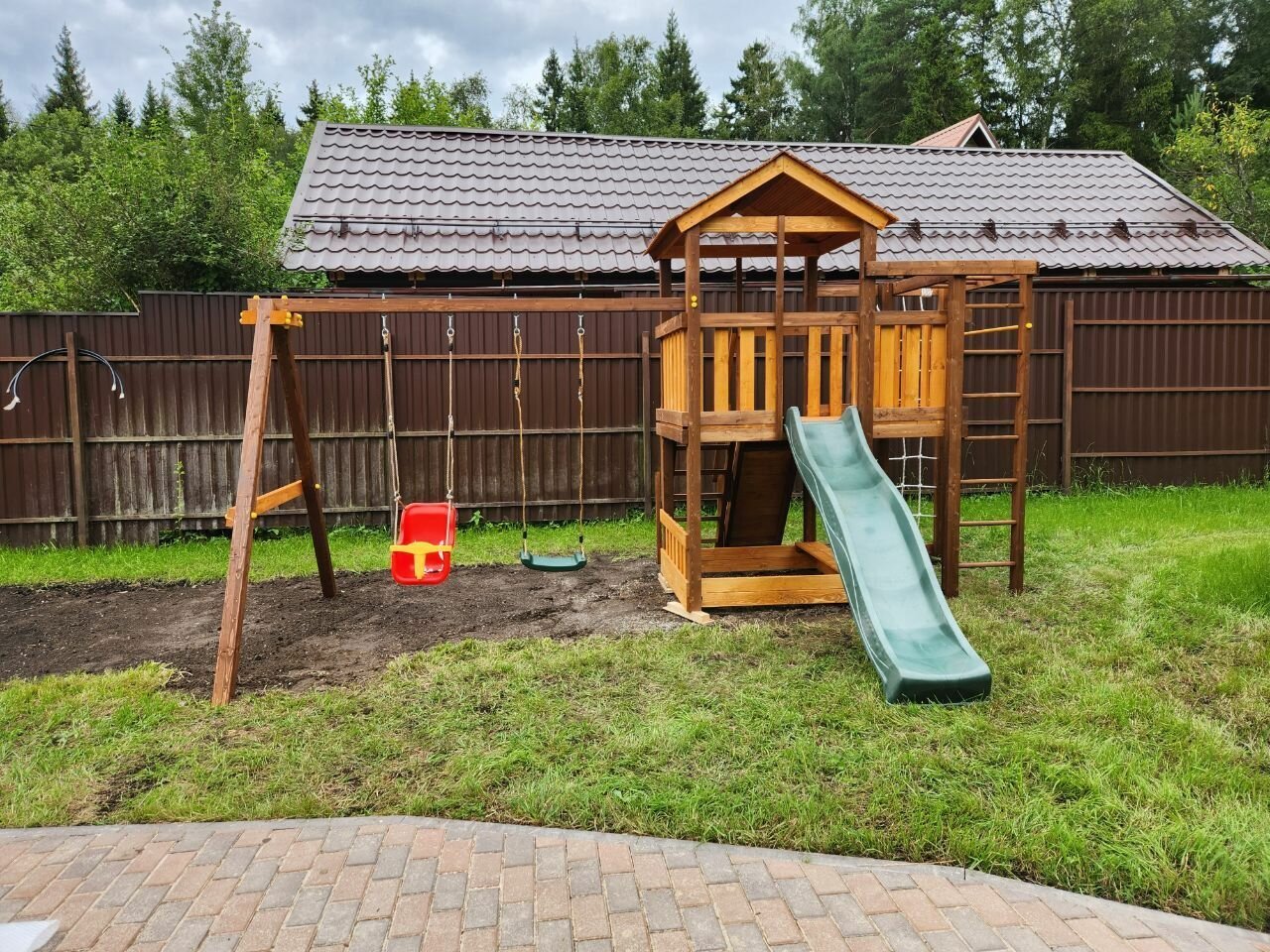 | В комплекте | брусья, домик, качели, лестница, песочница, сетка для лазания, Волнистая горка, Игровая веранда, Игровой модуль, Крыша, Перила |