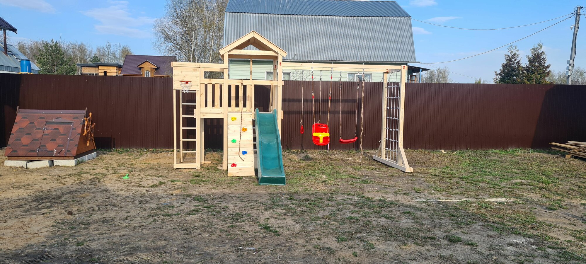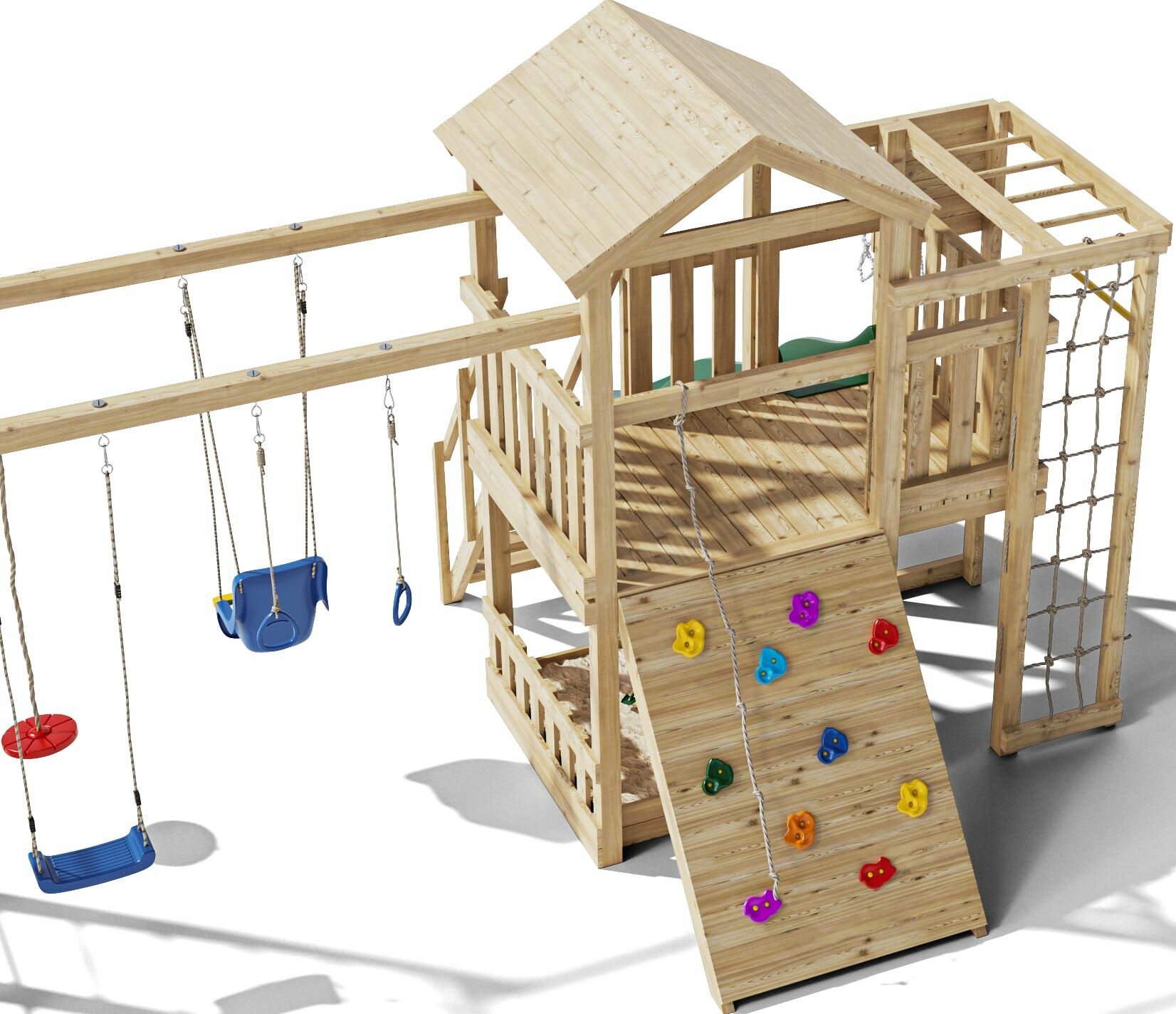 | В комплекте | брусья, домик, качели, лестница, песочница, сетка для лазания, Волнистая горка, Игровая веранда, Игровой модуль, Крыша, Перила |