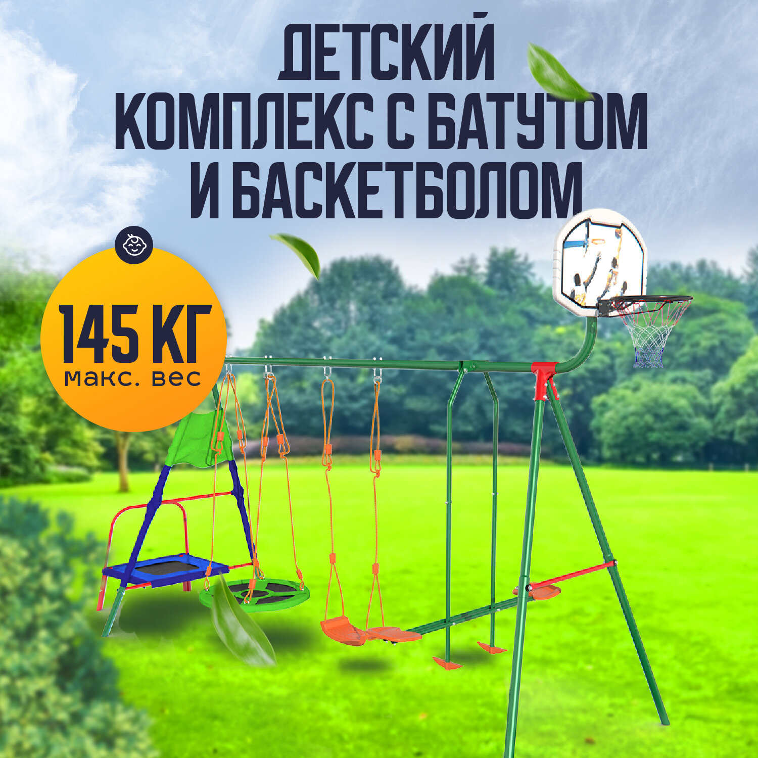 | В комплекте | баскетбольное кольцо, качели, батут, планер |