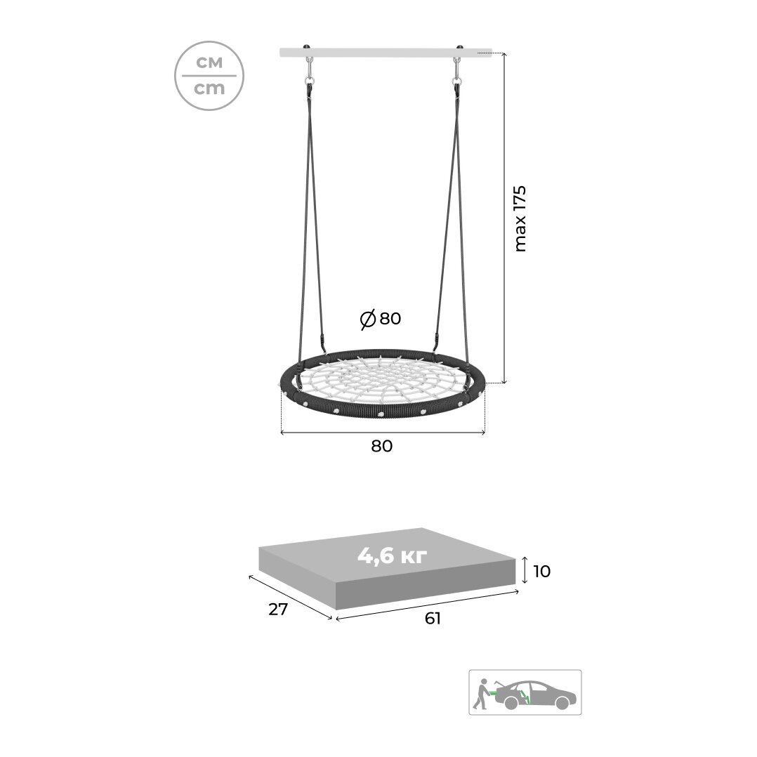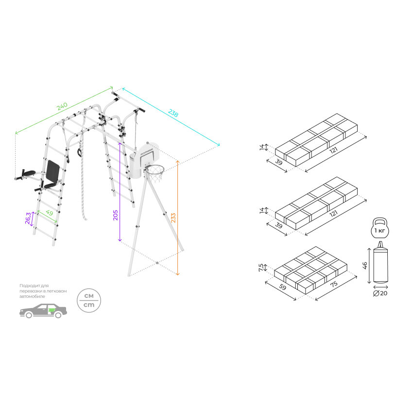 | В комплекте | баскетбольное кольцо, боксерская груша, брусья, канат, качели, лестница, рукоход, трапеция с кольцами, турник |