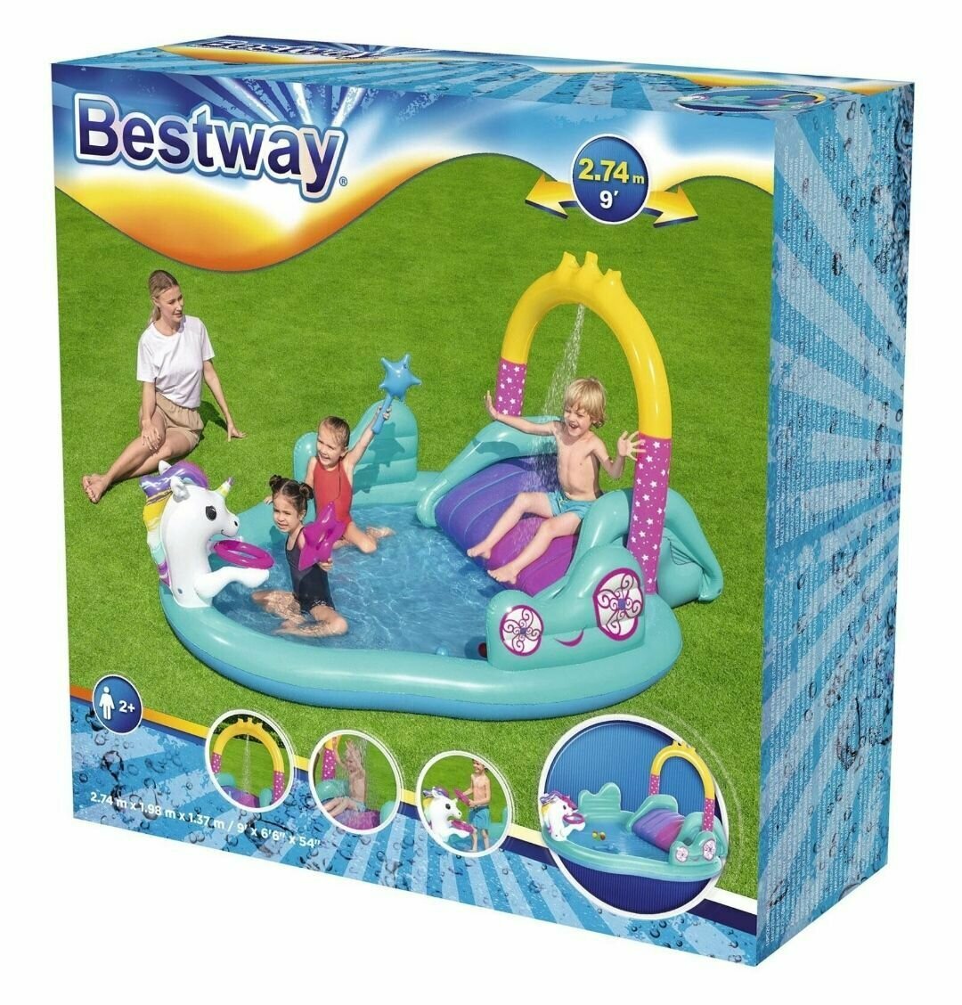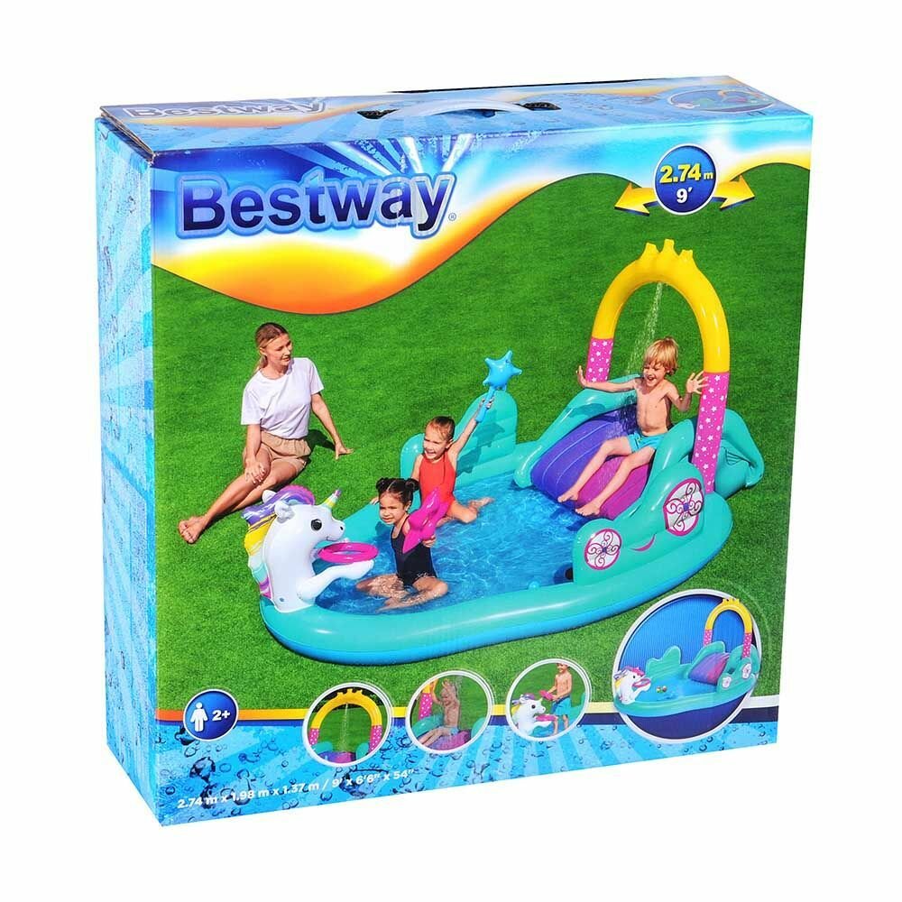 Купить Игровой центр "Волшебный единорог" с разбрызгивателем, горкой и игрушками, Bestway 53097, 274х198х137 см