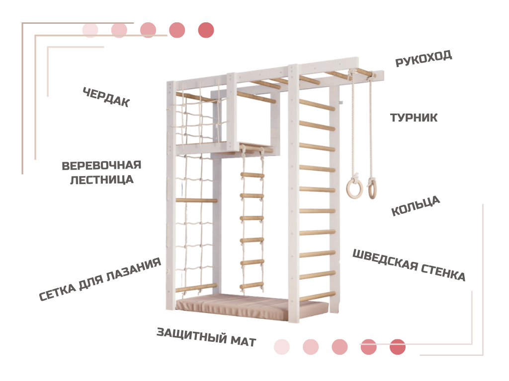 | Комплектация | Шведская стенка, Сетка для лазания, Чердак, Рукоход, турник, мат защитный, кольца, веревочная лестница |
