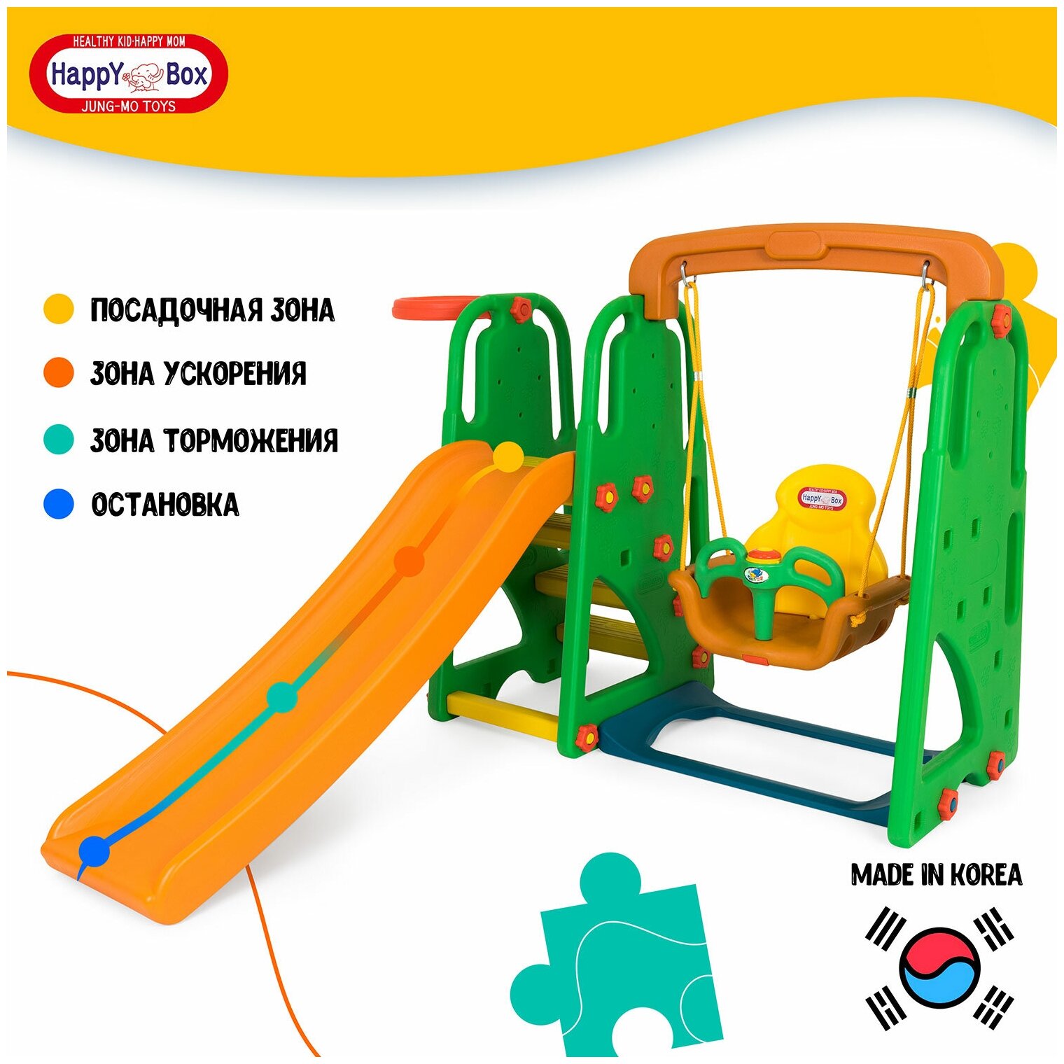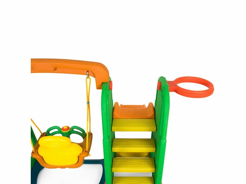 | Дополнительная информация | качели с музыкальной панелью; горка может устанавливаться с любой стороны от качелей; горку можно устанавливать в двух позициях, разных по высоте и наклону; баскетбольное кольцо можно крепить с любой стороны конструкции; количество горок: 1; количество качелей: 1 |