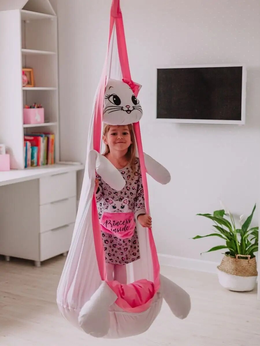 СохранитьДетское подвесное кресло качели Кокон Кошечка от бренда Покачайка, двухцветное, бескаркасное интересное:
