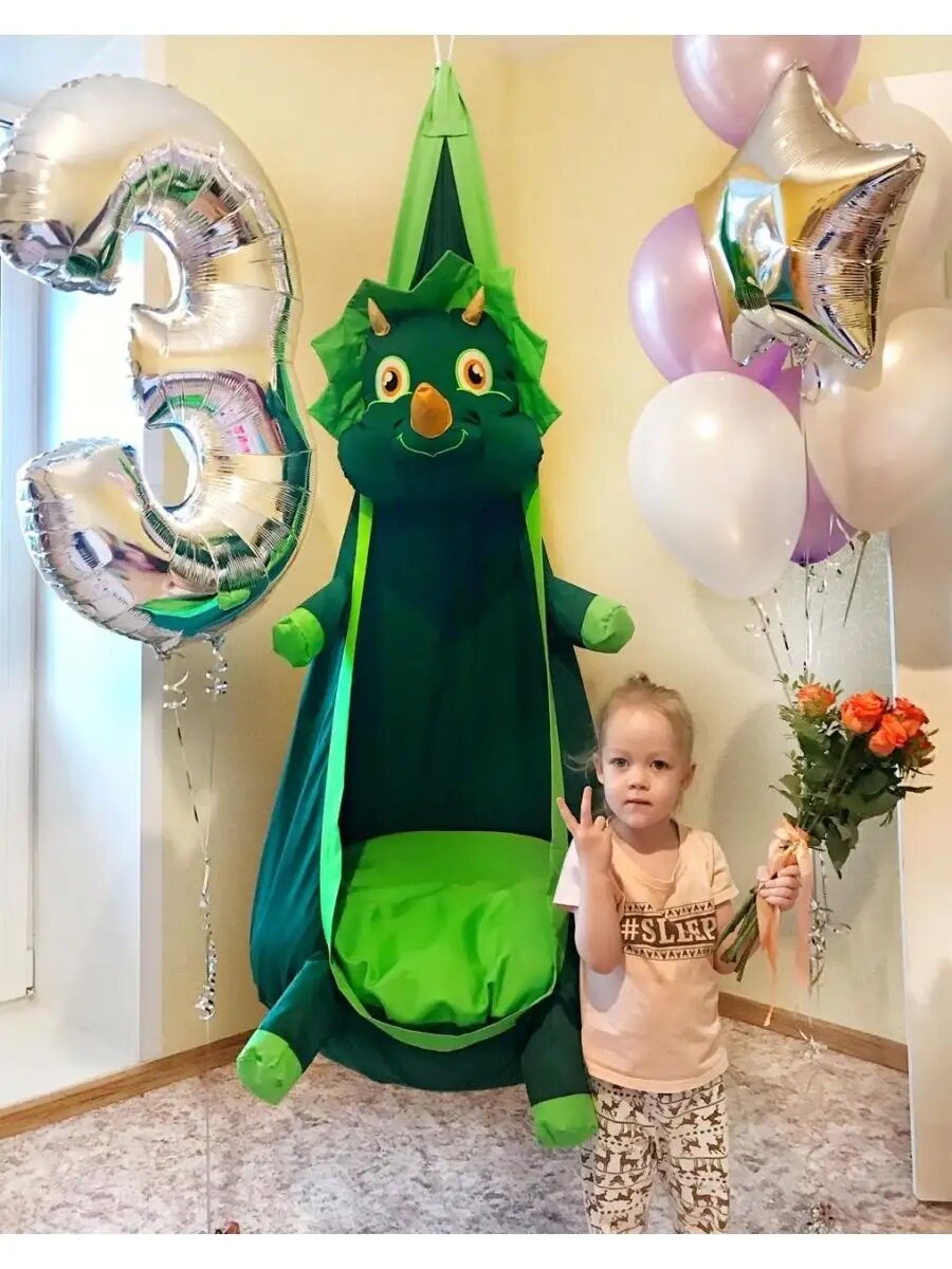СохранитьДетское подвесное кресло качели Кокон Дино от бренда Покачайка, двухцветное, бескаркасное интересное: