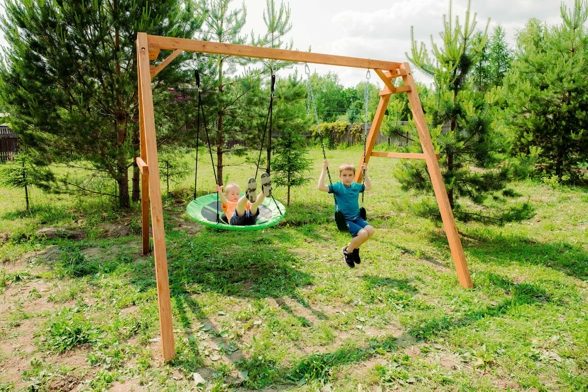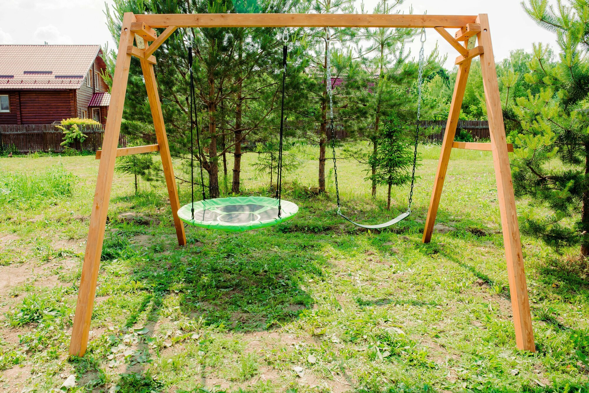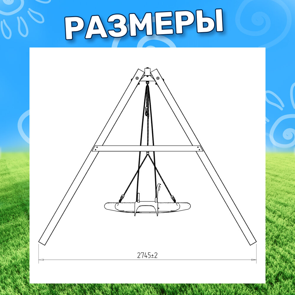 | Комплектация | Деревянный каркас, гибкие качели и гнездо Свиби, карабины и кронштейны. |