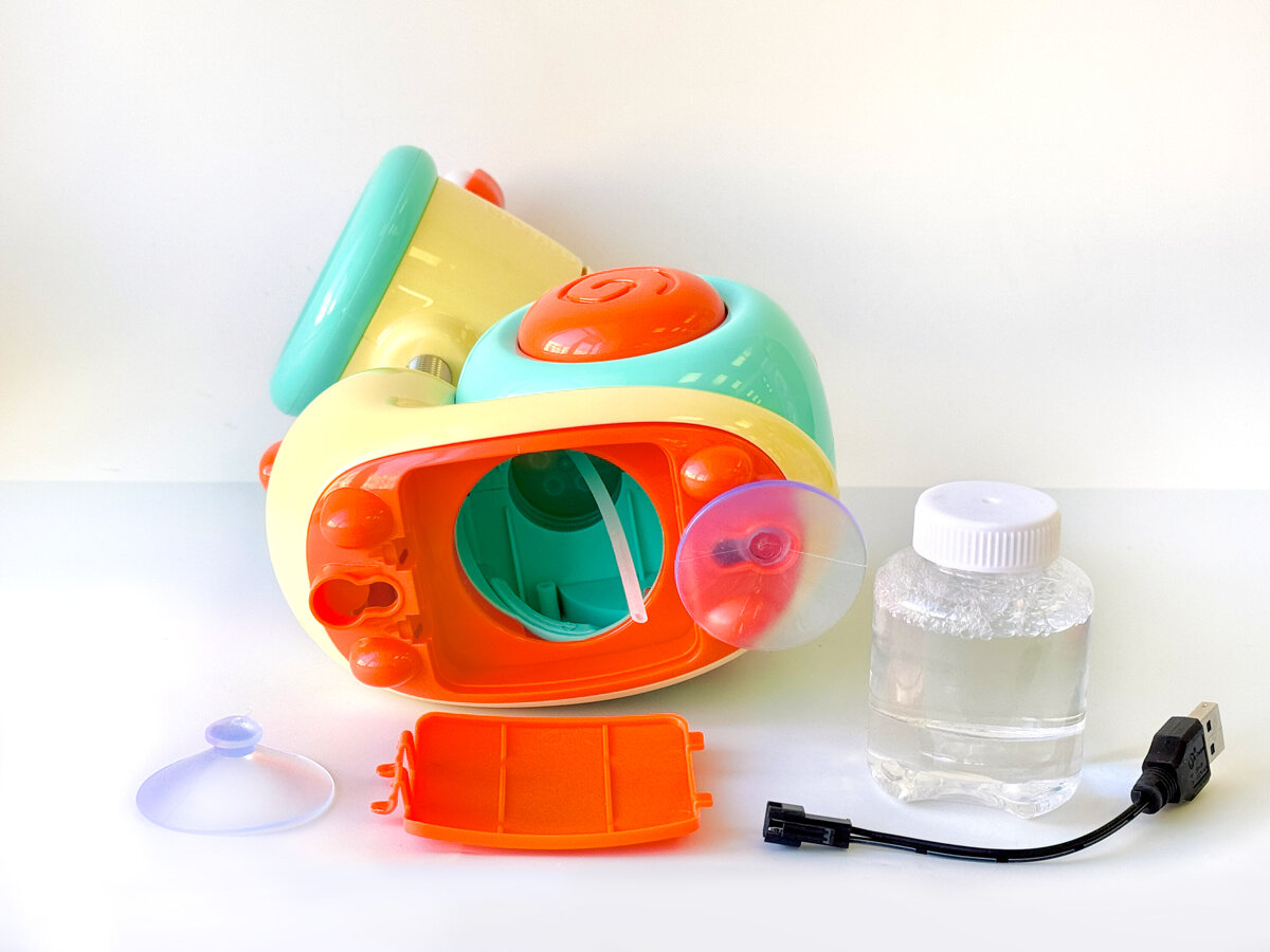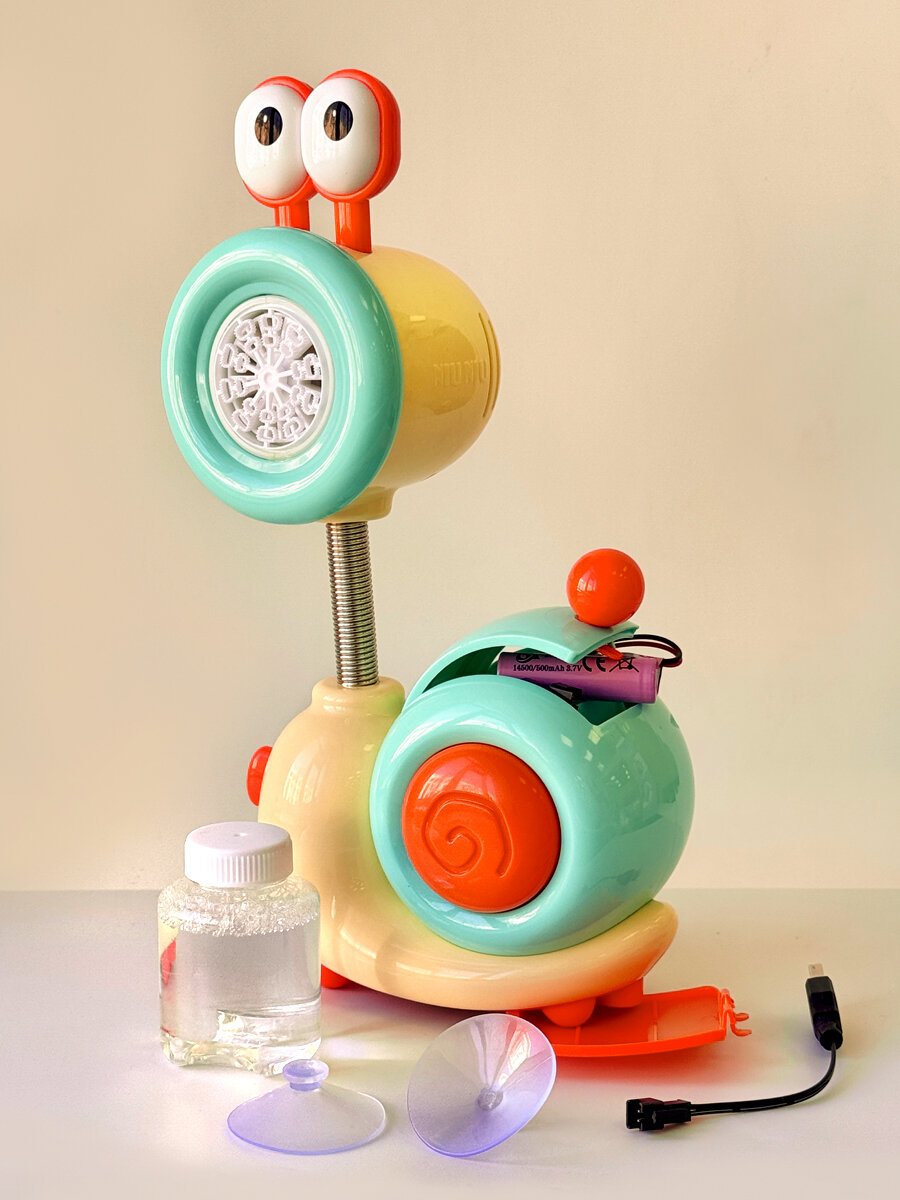 Генератор мыльных пузырей Улитка, с аккумулятором и зарядным кабелем, в комплекте 1 бутылочка 90 мл интересное: