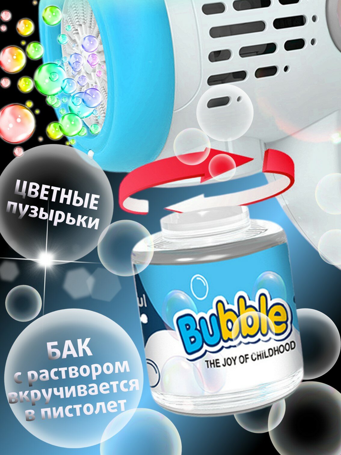 | Дополнительная информация | бак с мыльным раствором вкручивается в устройство для мыльных пузырей |