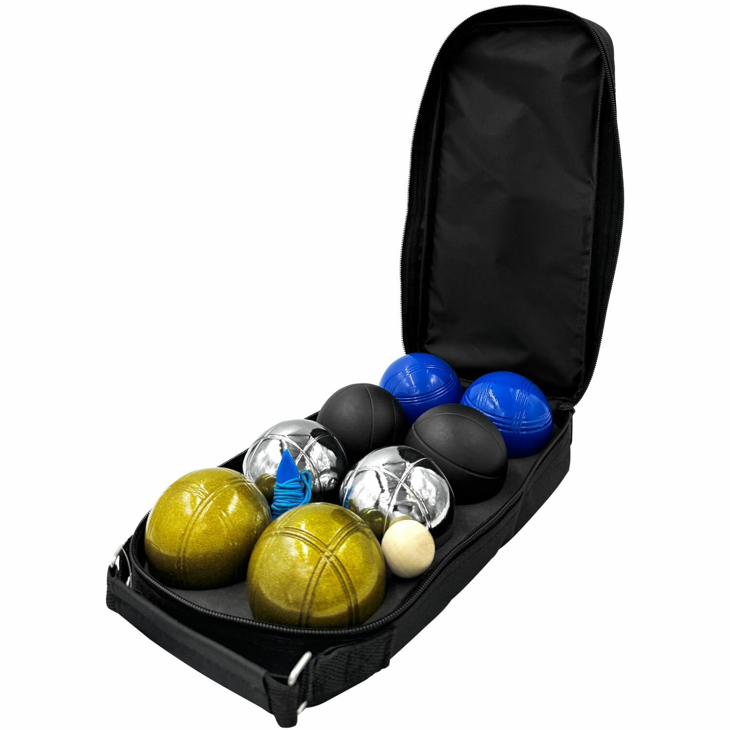 | В комплекте | 6 больших шаров для бросков, 1 маленький шар-мишень «кошонет», мерная веревка с колышком для очерчивания круга, футляр для хранения и переноски |