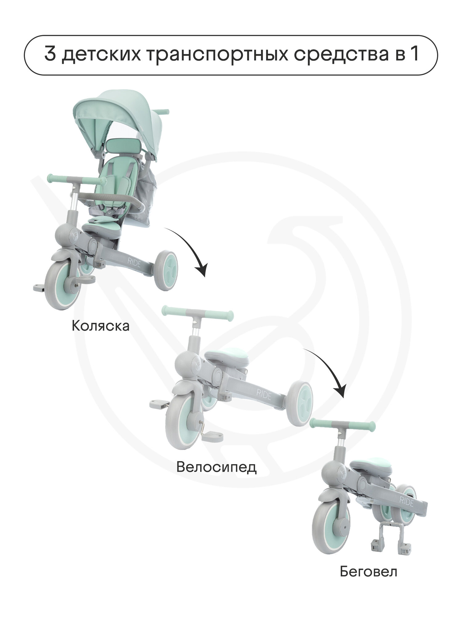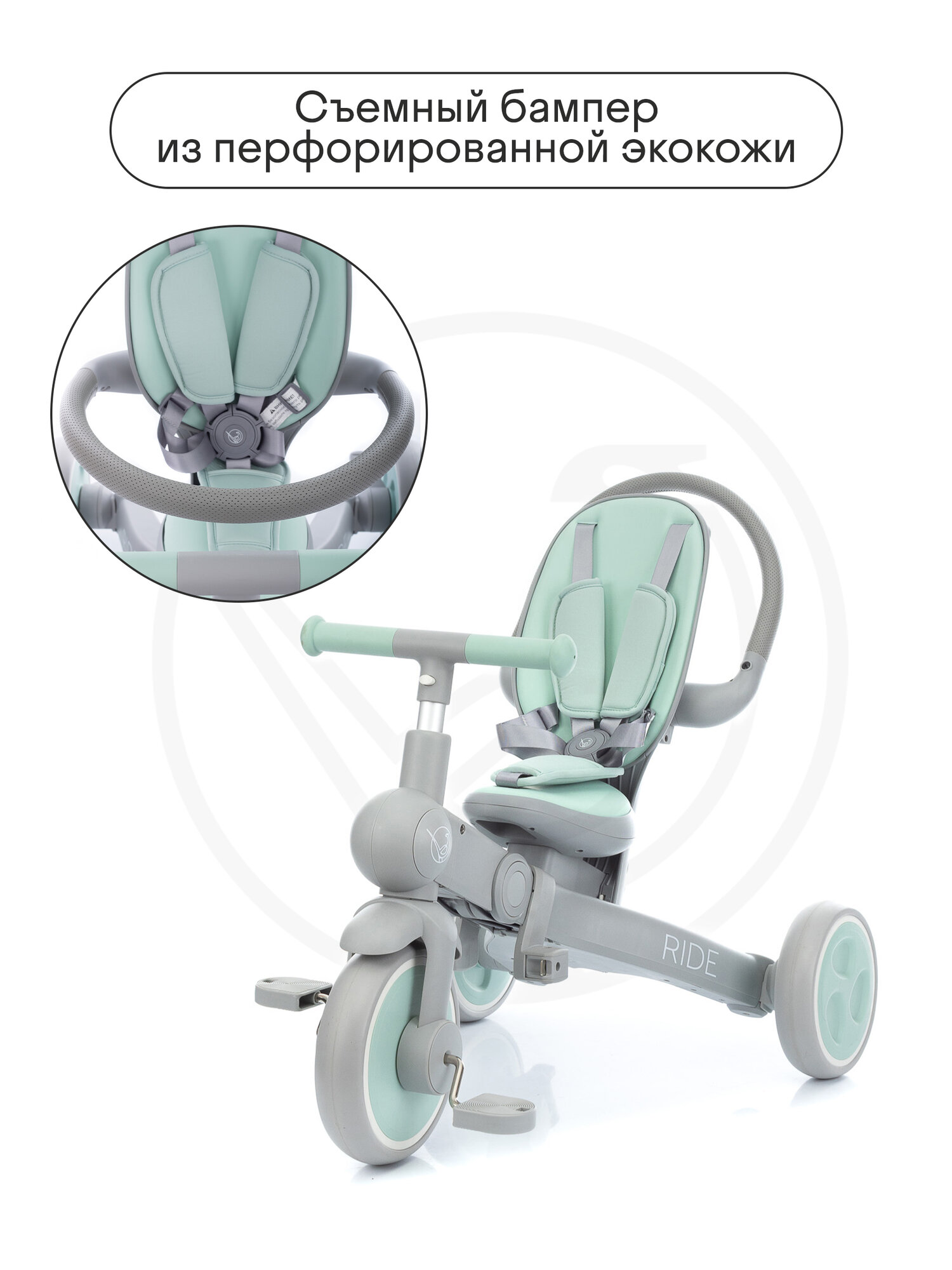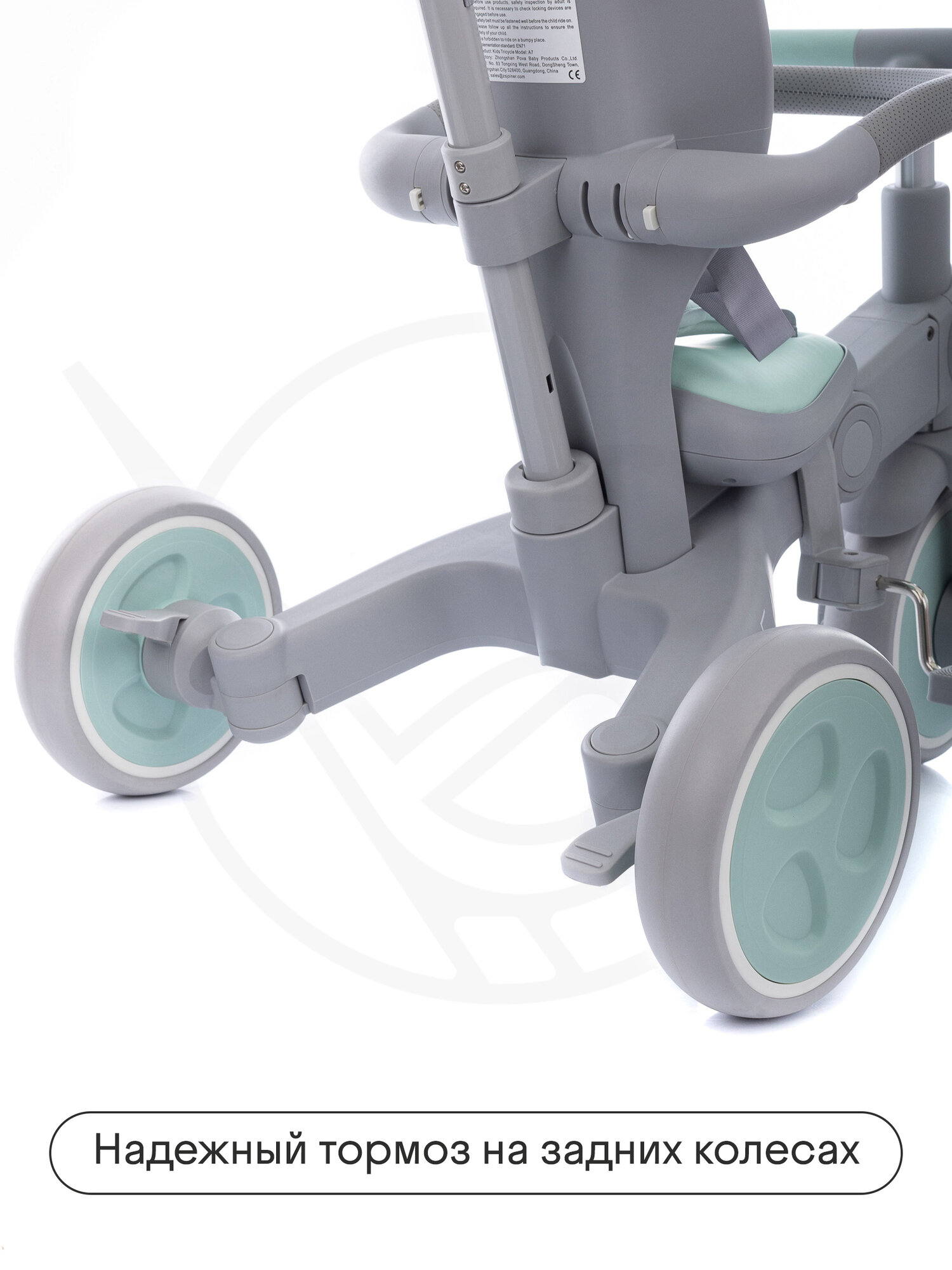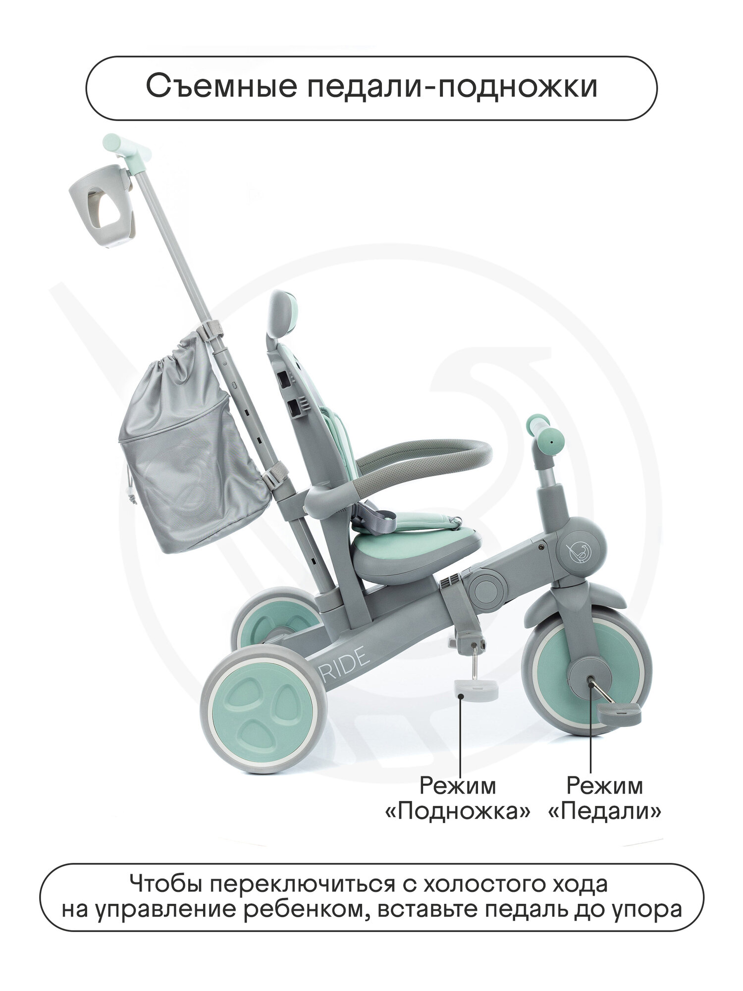 Велосипед детский трехколесный с ручкой Kidzi Ride, аксессуары в комплекте, складной, мятный/серый интересное: