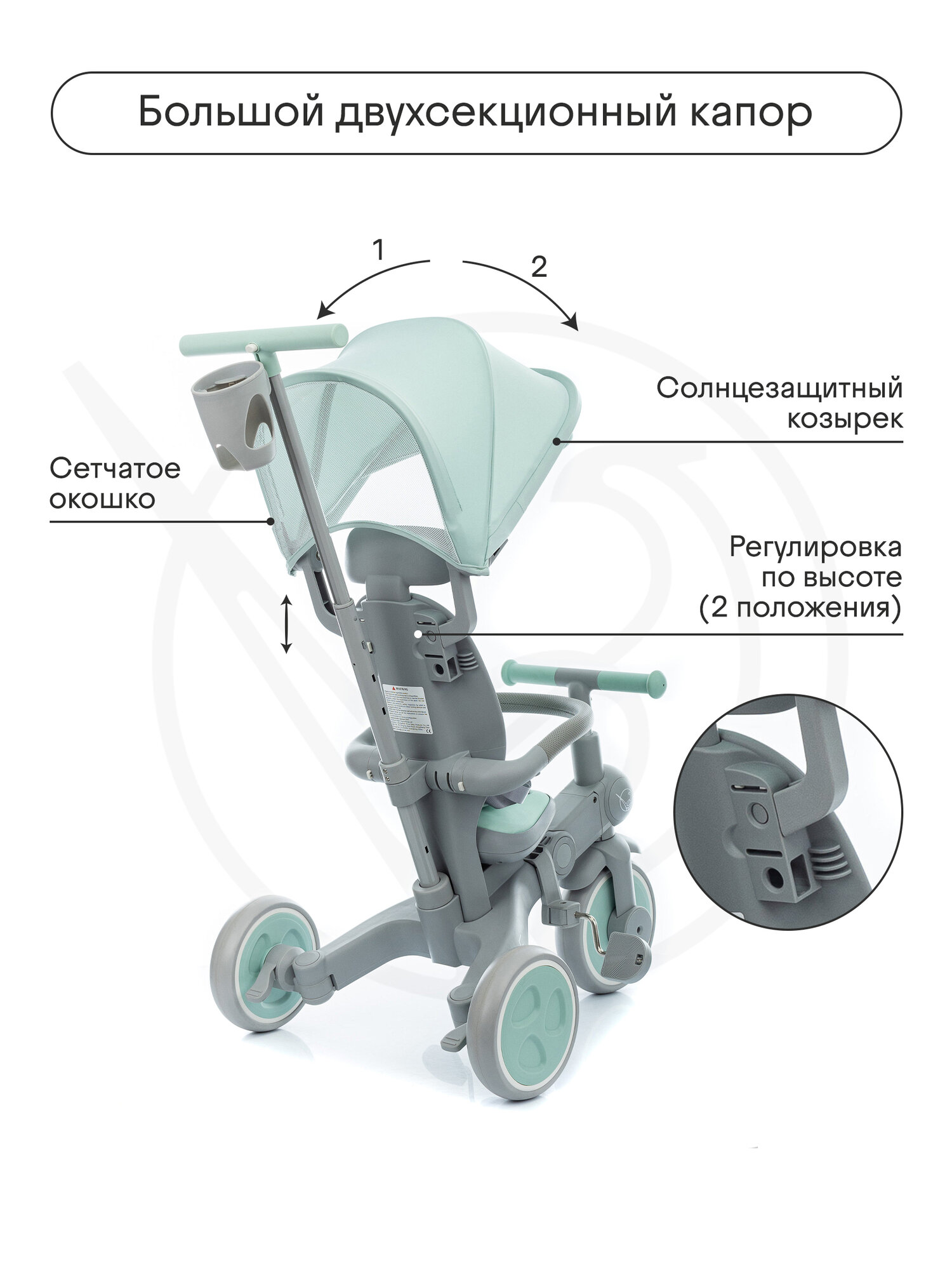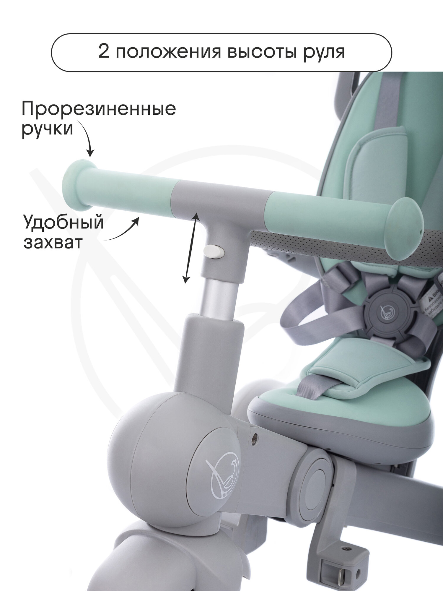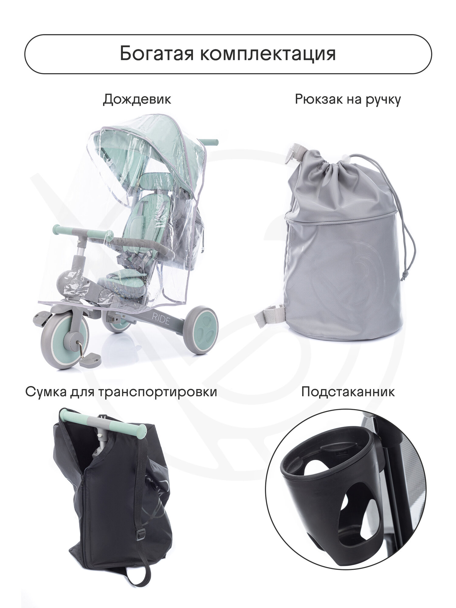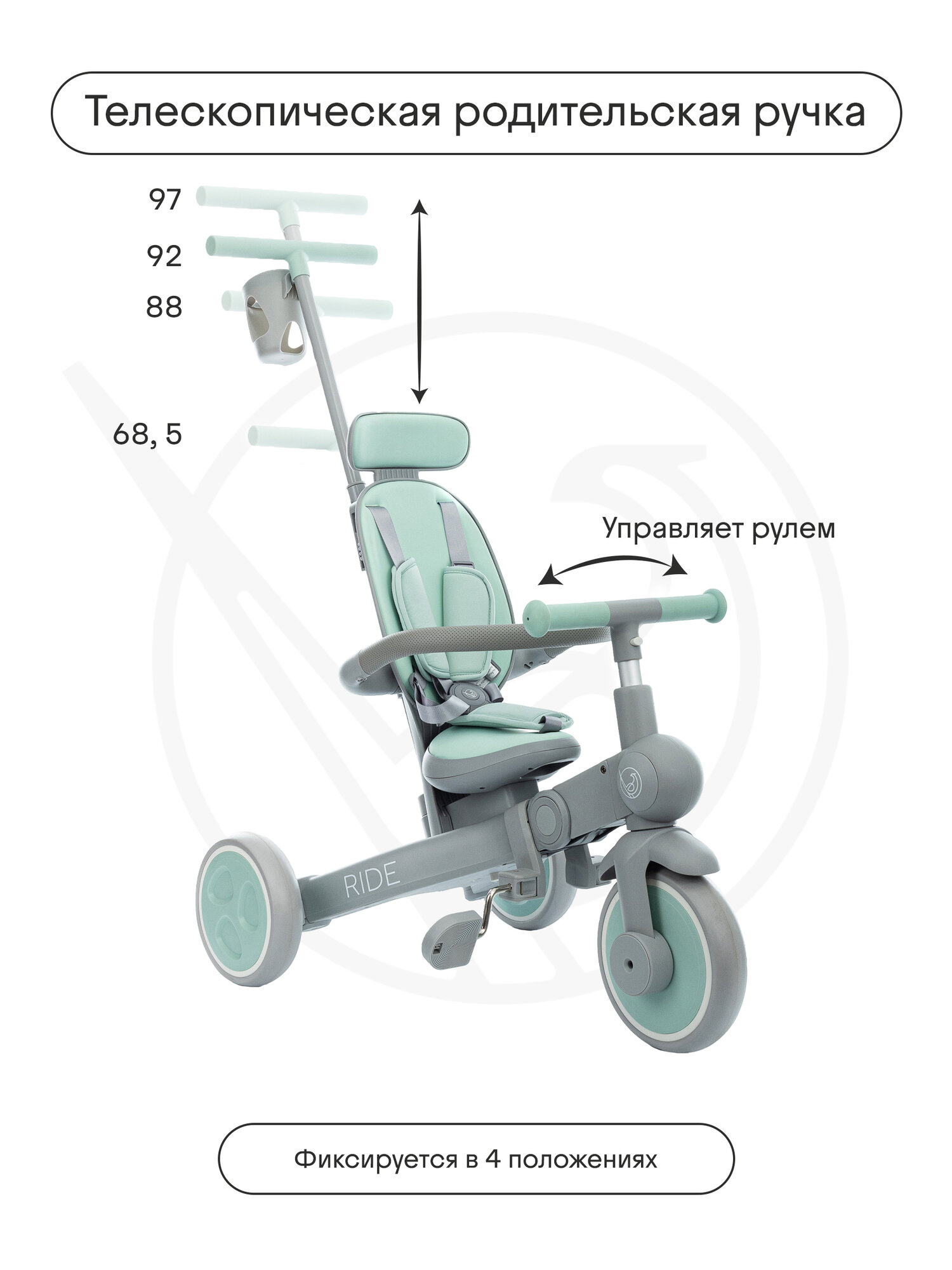 Велосипед детский трехколесный с ручкой Kidzi Ride, аксессуары в комплекте, складной, мятный/серый интересное: