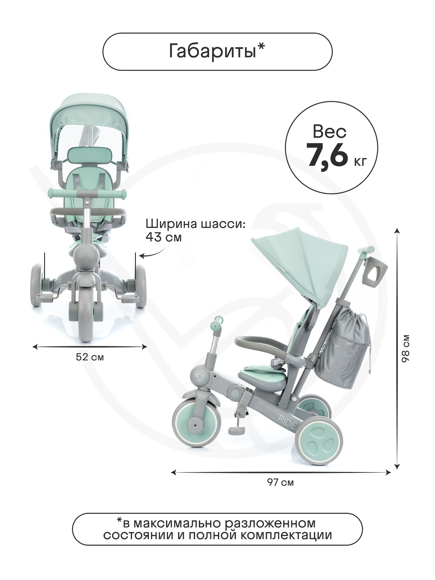 | Особенности конструкции | складной / Вентилируемое окошко / Дождевик / Козырек от солнца / Корзина для вещей и покупок / Мягкое седло / Подстаканник / Ремни безопасности / Родительская ручка / Стояночный тормоз / Сумка |
