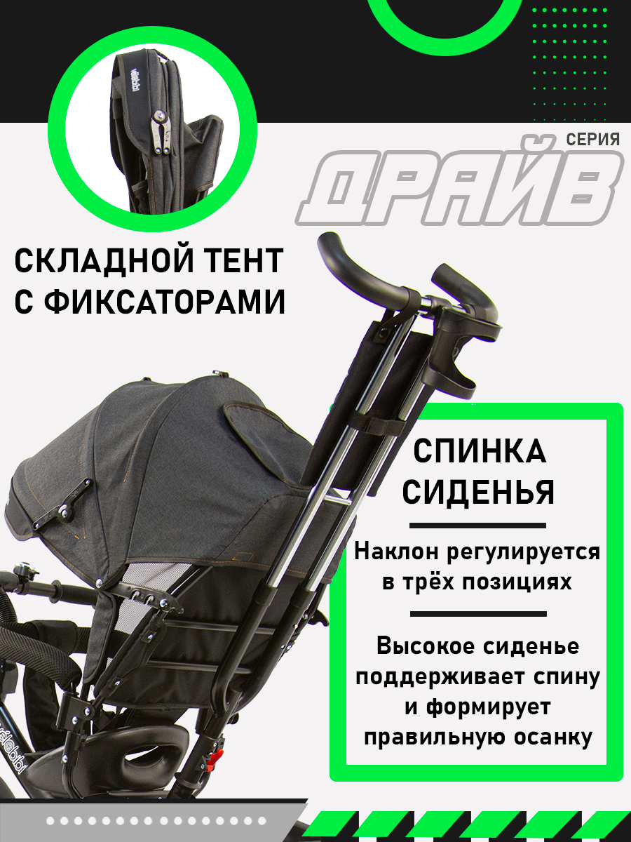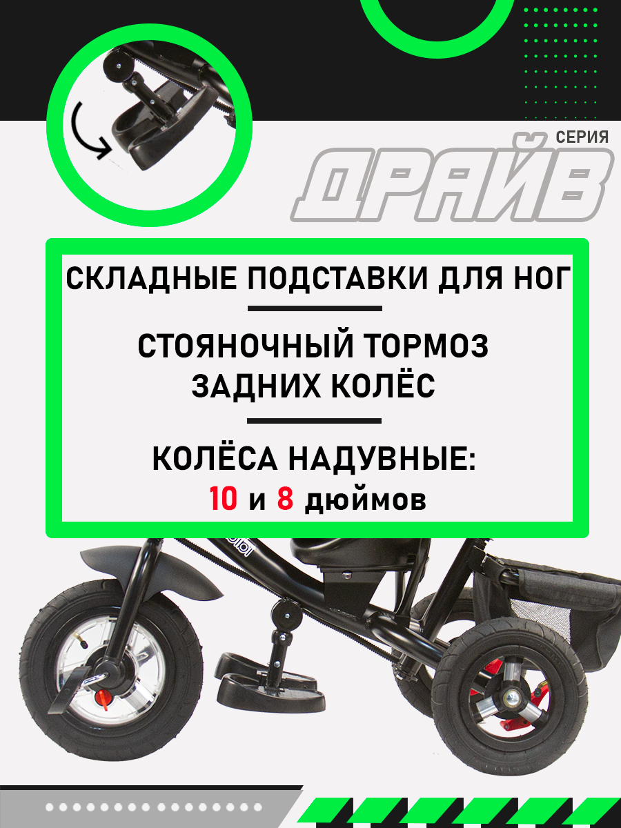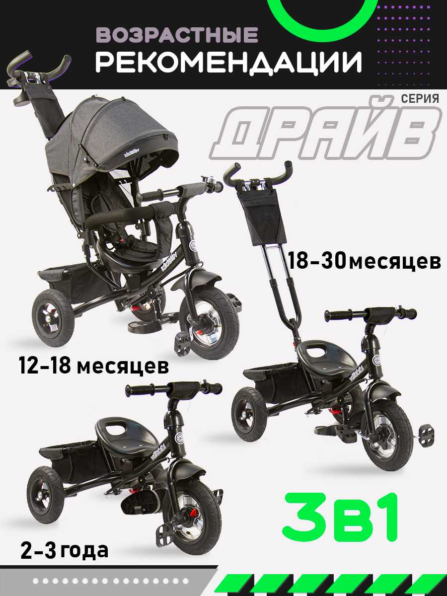 СохранитьВелосипед трёхколесный с ручкой ДРАЙВ (колеса надувные 10"/8" корзина) графит интересное: