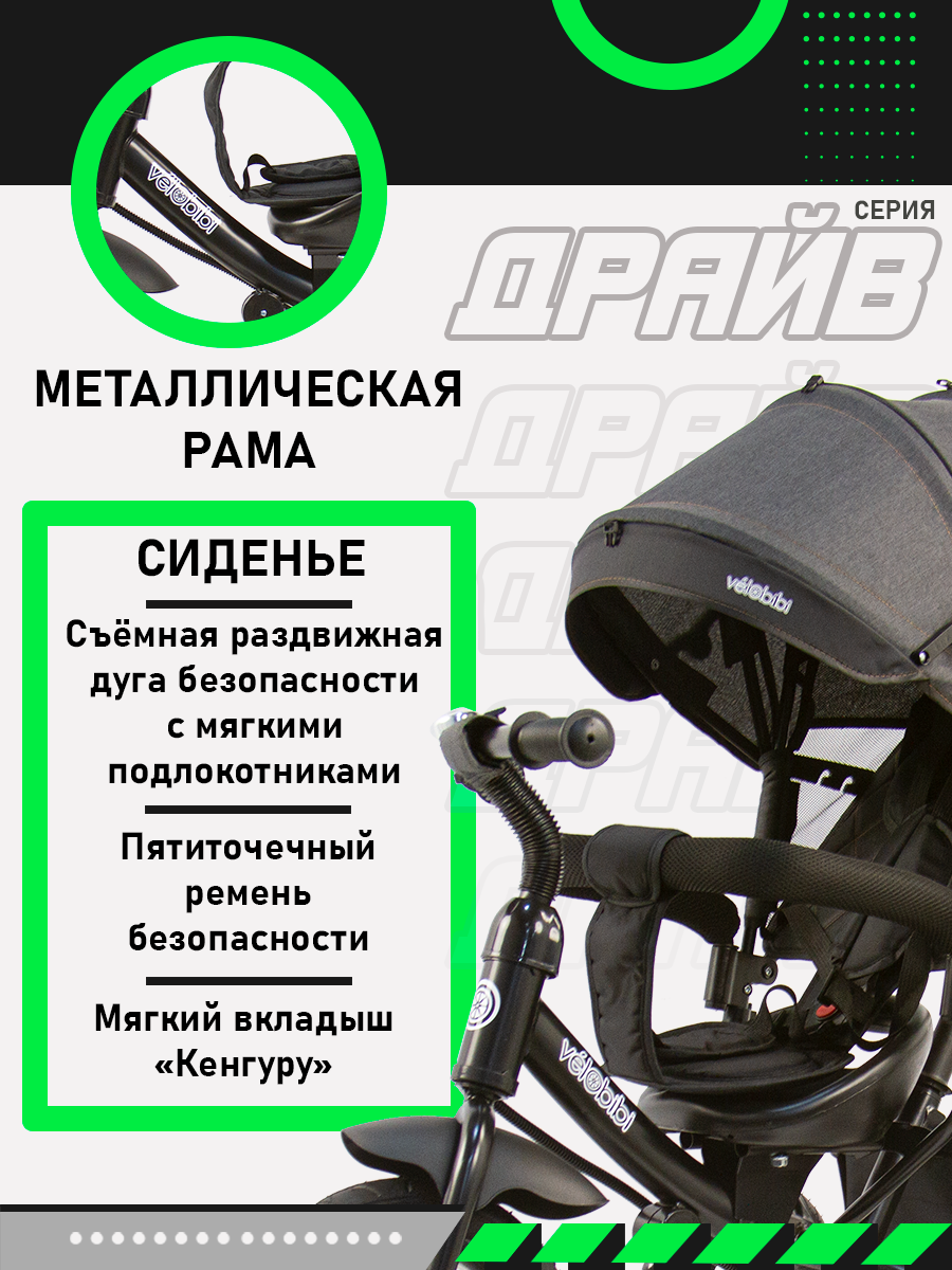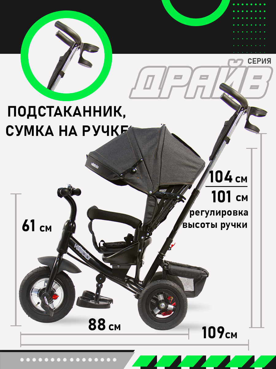 Купить Велосипед трёхколесный с ручкой ДРАЙВ (колеса надувные 10"/8" корзина) графит