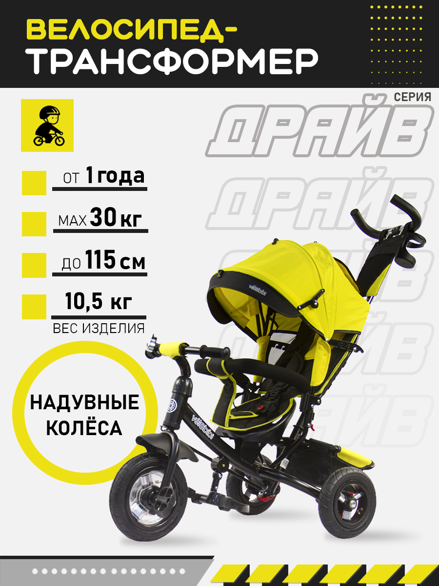 Купить Велосипед-трансформер трёхколёсный с ручкой ДРАЙВ (колеса надувные 10"/8", корзина), желтый