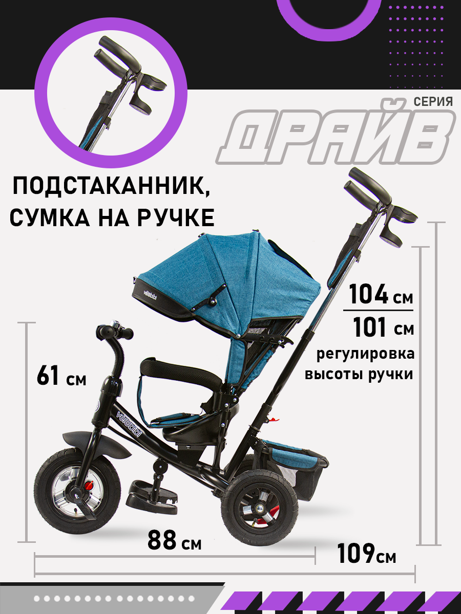 Велосипед трёхколесный с ручкой ДРАЙВ (колеса надувные 10"/8" корзина) графит