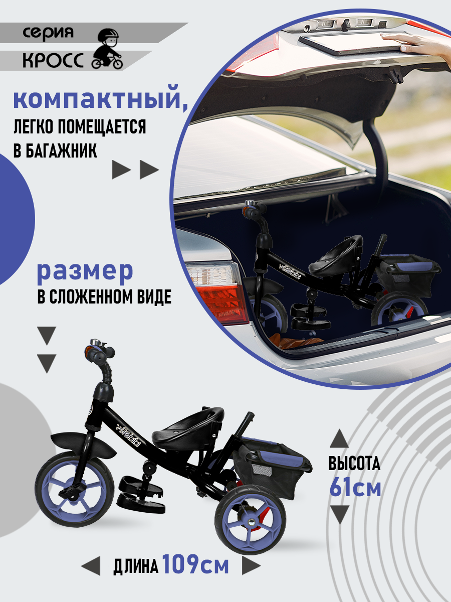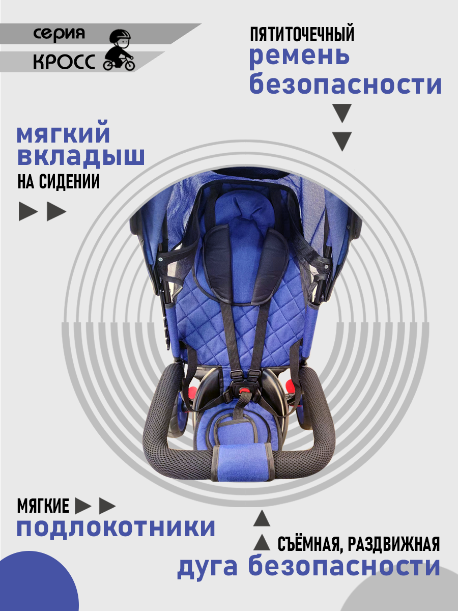 | Комплектация | В комплектацию велосипеда входит: звонок, складной козырек, дуга безопасности съемная и раздвижная, подставка для ног складные, сумка на ручке, подстаканник, вместительная корзина, стояночный тормоз задних колес, мягкий вкладыш на сидении. |
