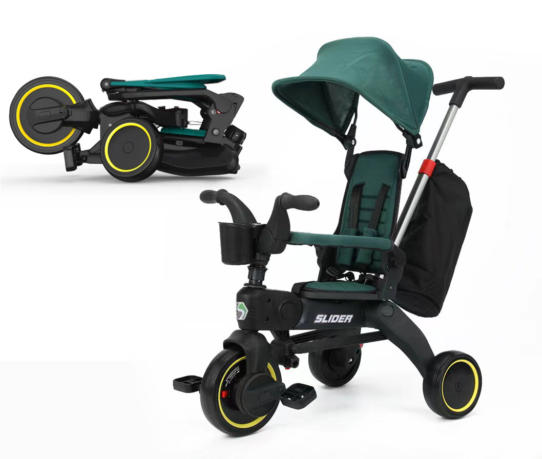 Велосипед 3-х колесный с ручкой управления, складной, тормоз, сумка, рама: пластик, колеса: 10 и 8 дюймов зеленый интересное: