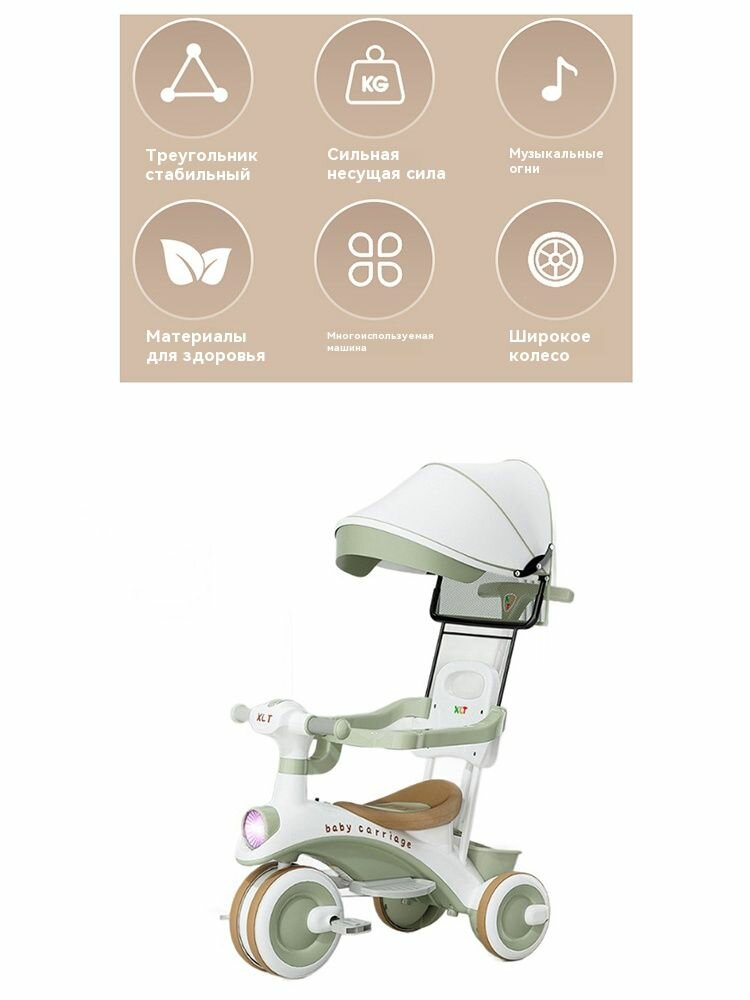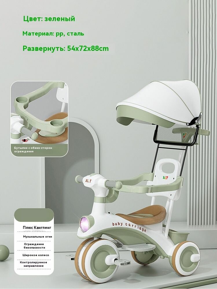 Коляска велосипедная PT906, трехколесная, с музыкой и светом, для детей от 1 года, салатовая интересное: