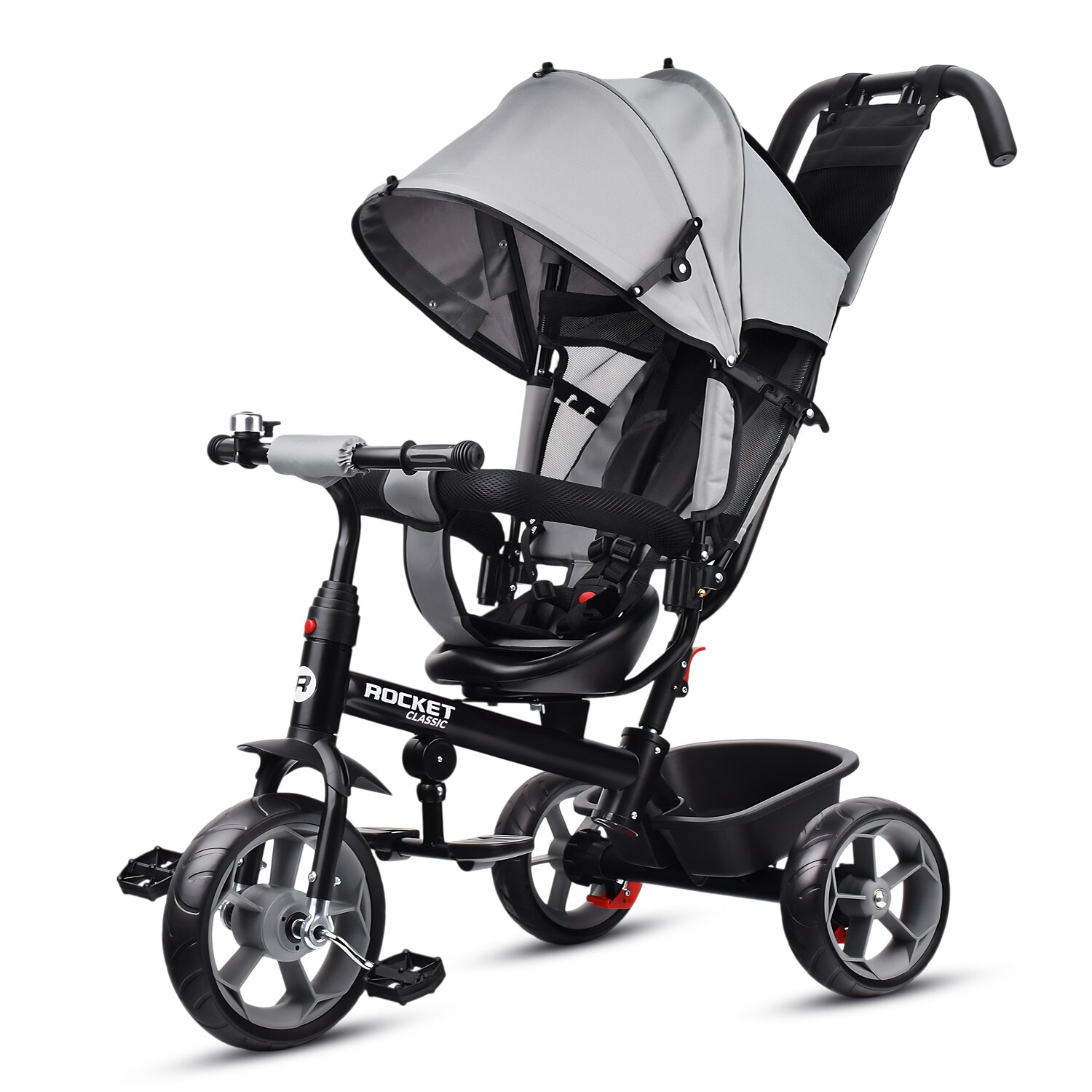 Купить Велосипед Rocket 136 трехколесный с родительской ручкой и козырьком, колеса EVA 10"/8", цвет серый