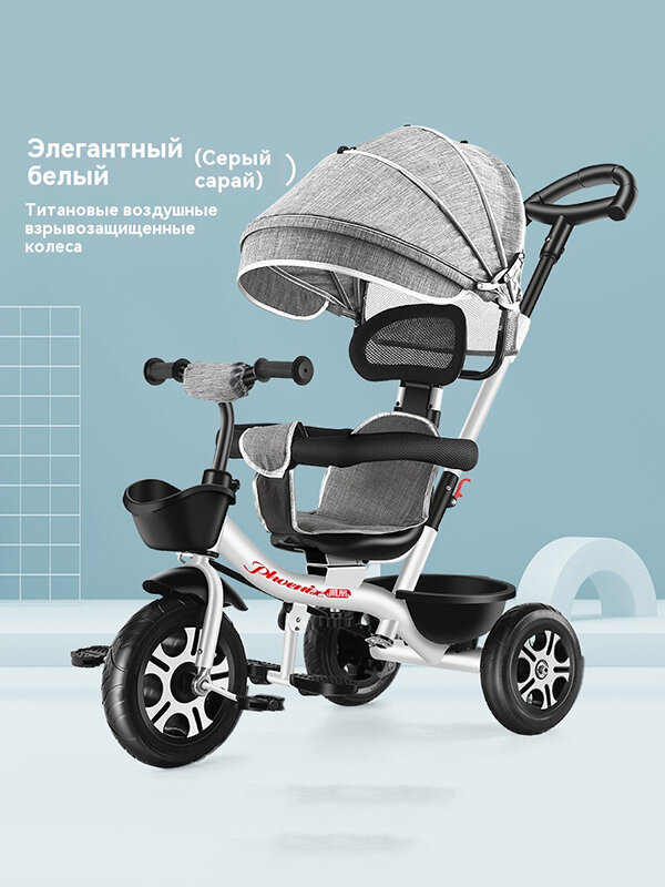 Велосипед трехколесный, с ручкой, складная крыша, сталь, Тяжелый 50кг, 6 дюймов, светло-розовый