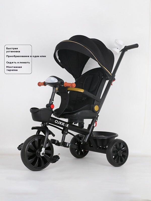 Детский велосипед-коляска 4в1, с родительской рукояткой, трёхколесный, чёрный